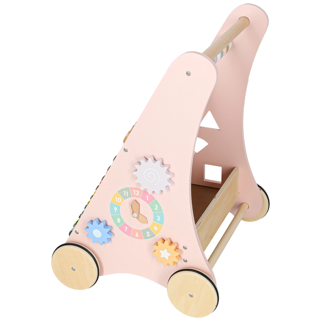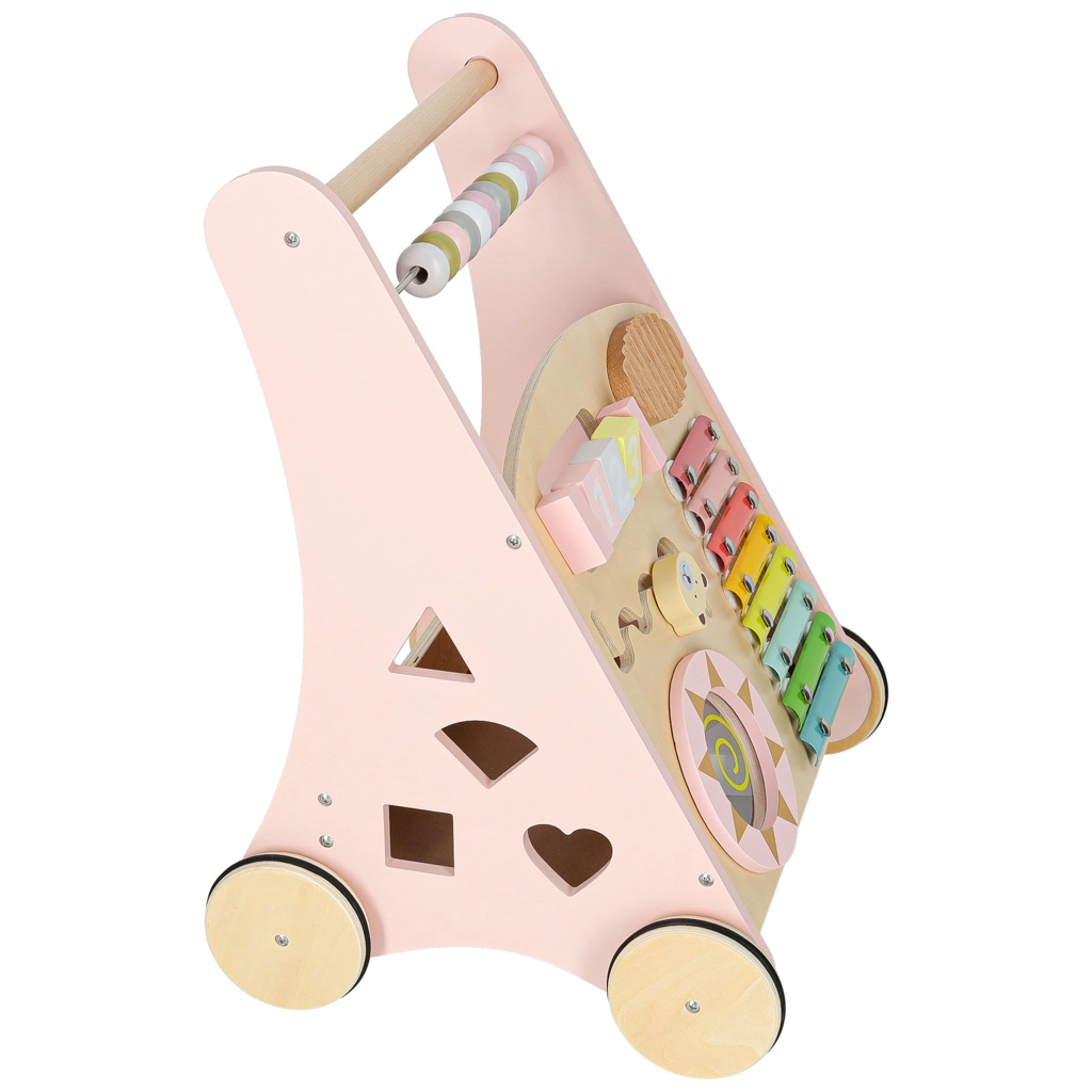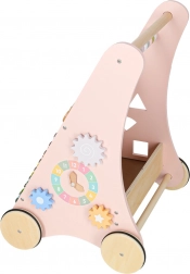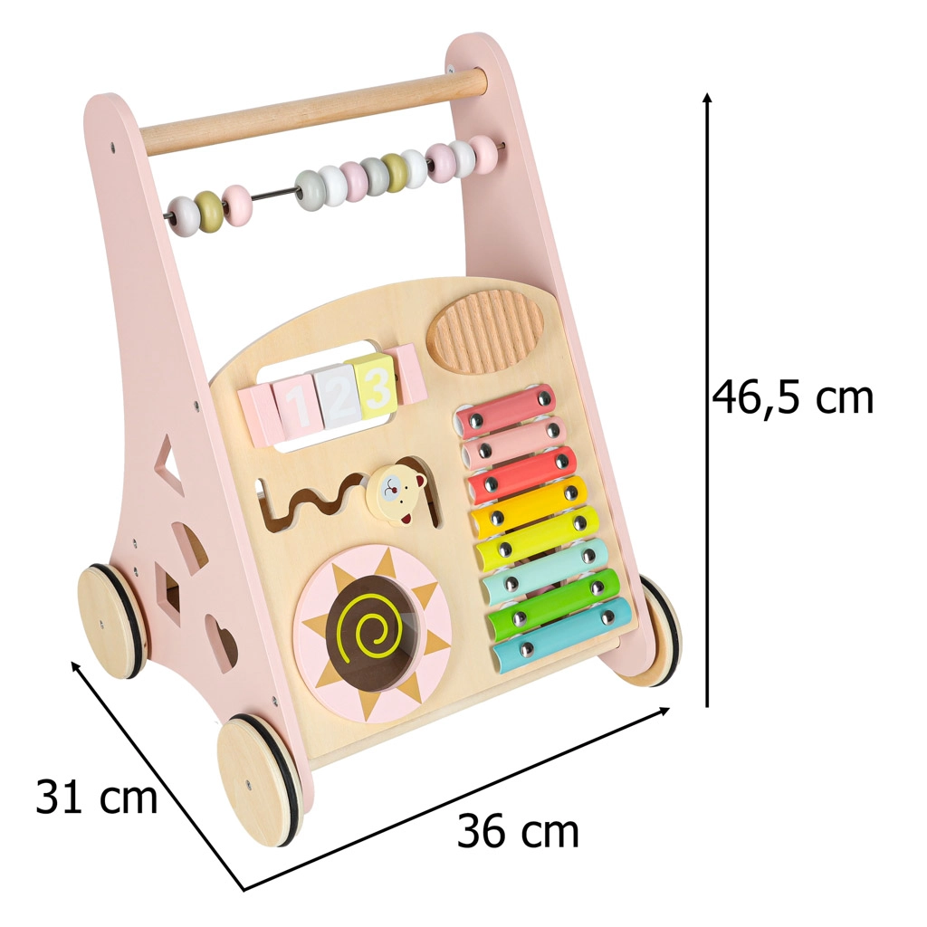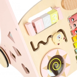 Ovo moderno drveno guralo u pastelno ružičastoj boji podržava ravnotežu, koordinaciju i sigurnost pri hodu. Prednja ploča opremljena je brojnim aktivnostima: računaljkom za prve račune, ksilofonom za otkrivanje zvukova, zupčanicima, okretnim diskom, razvrstavanjem oblika i kliznim elementima koji razvijaju finu motoriku i koncentraciju.