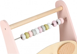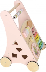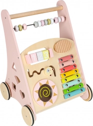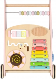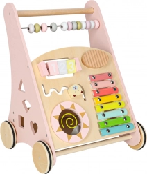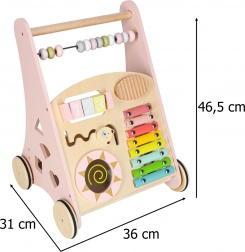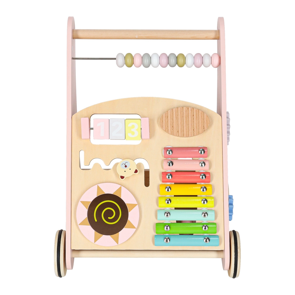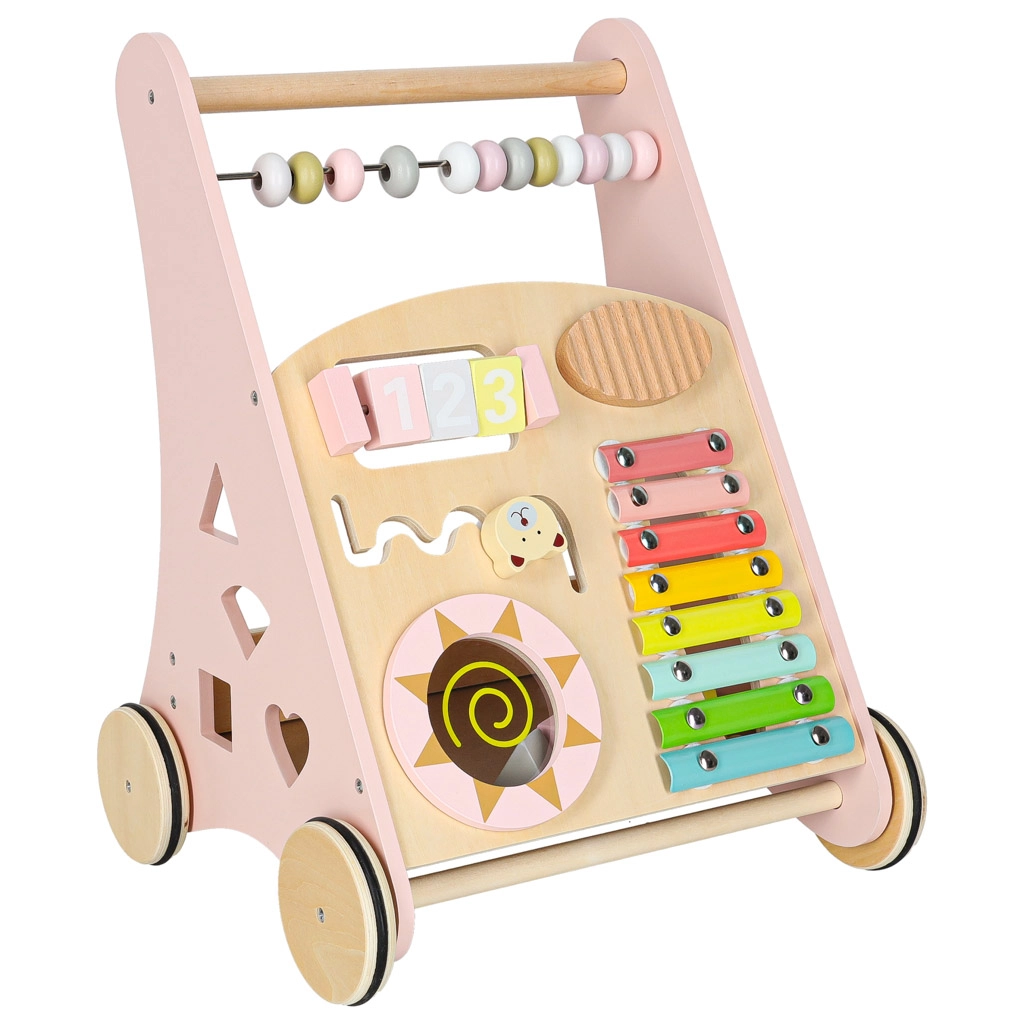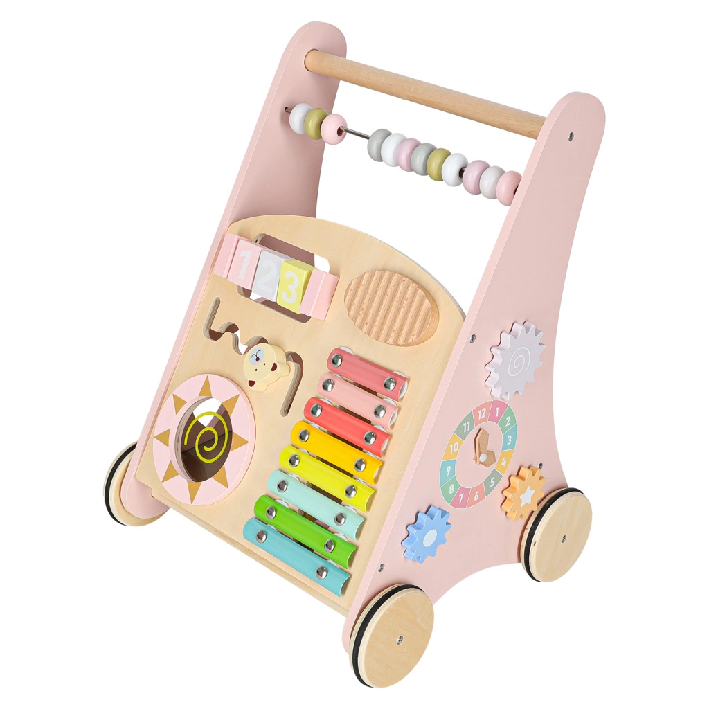 Ovo moderno drveno guralo u pastelno ružičastoj boji podržava ravnotežu, koordinaciju i sigurnost pri hodu. Prednja ploča opremljena je brojnim aktivnostima: računaljkom za prve račune, ksilofonom za otkrivanje zvukova, zupčanicima, okretnim diskom, razvrstavanjem oblika i kliznim elementima koji razvijaju finu motoriku i koncentraciju.