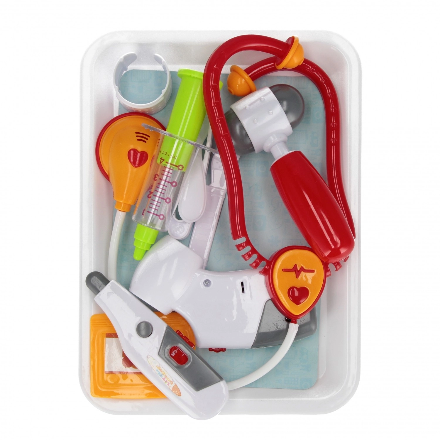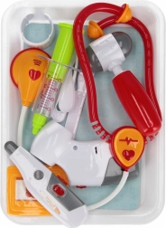Dio pakiranja su pladanj, stetoskop, šprica, pinceta, flaster, nožić, žličica, refleksno čekić, pulsni oksimetar, toplomjer i identifikacijska iskaznica. Idealno za zajedničku igru braće i prijatelja te za prvo upoznavanje s liječničkim okruženjem kroz sigurnu imitativnu igru.