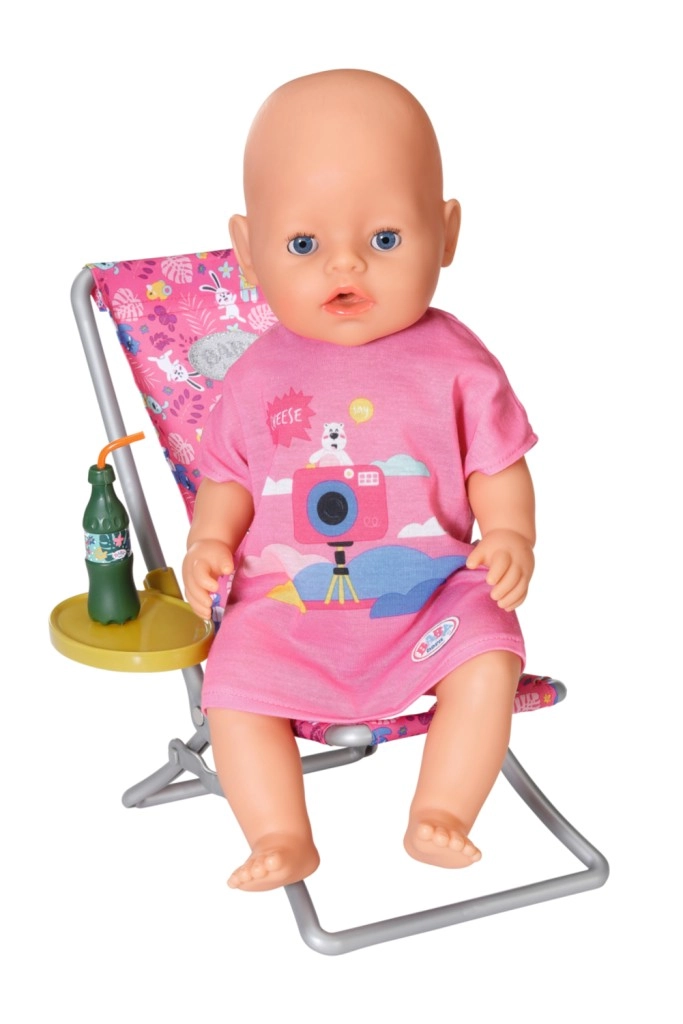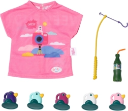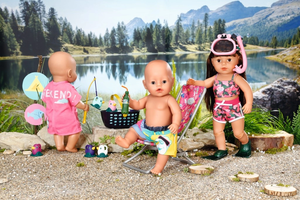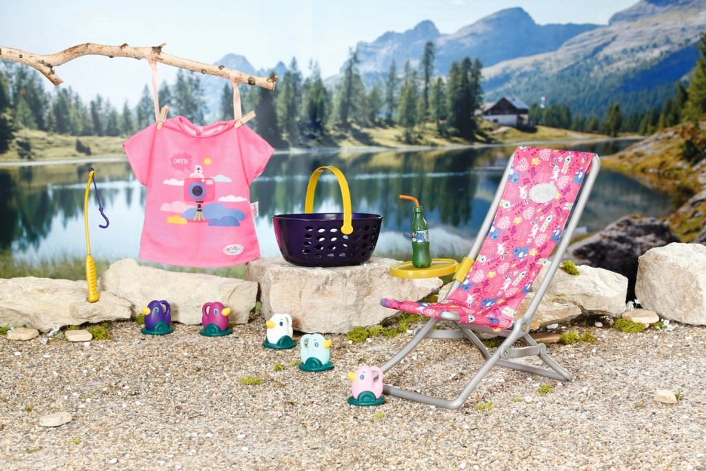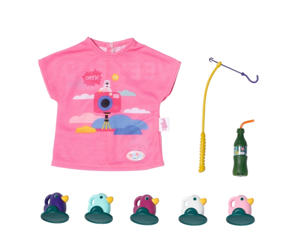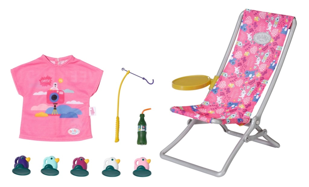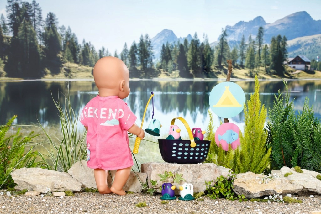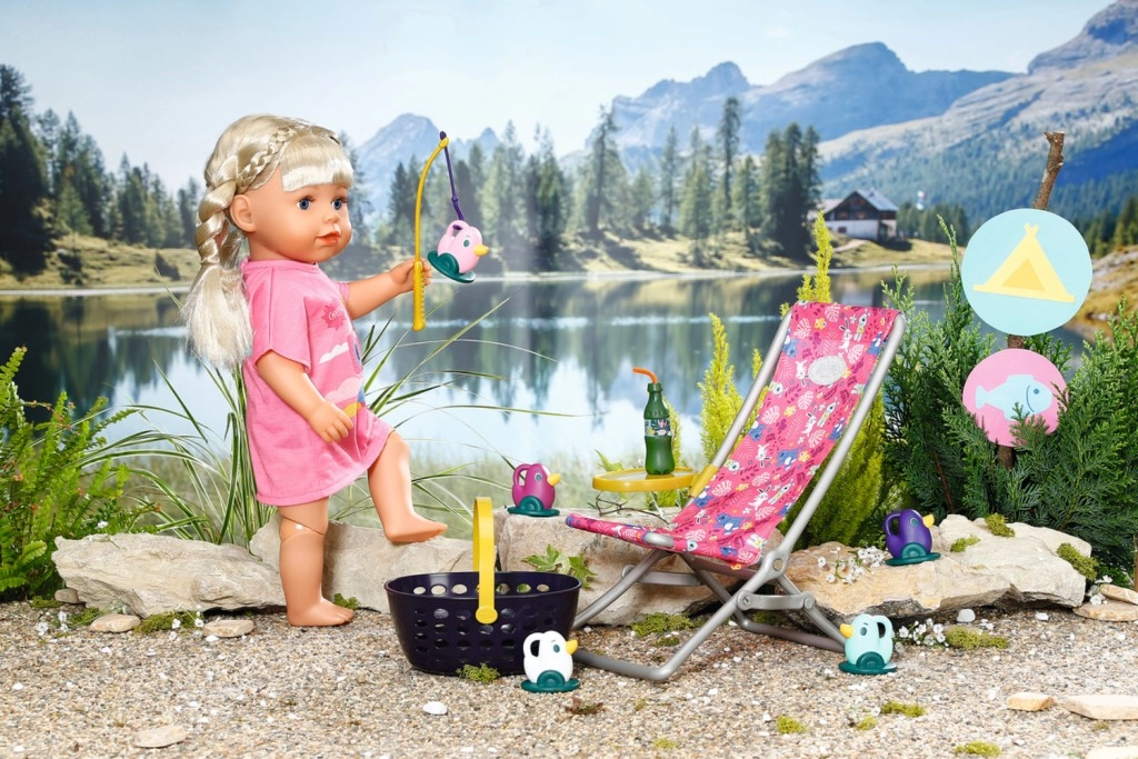 "U moru ima puno više riba…" Ali BABY born radije lovi slatke pačiće. Dok udobno sjedi u ružičastoj ležaljci s šarenim uzorkom, pokušava na udicu štapa uloviti jednoga od pet pačića. Tu i tamo otpije gutljaj limunade koju drži na žutom stoliću pokraj ležaljke. Kada ulovi sve pačiće i spremi ih u plavu košaru, vraća ih natrag u ribnjak i zabavna igra može početi ispočetka. Za ovu igru pecanja BABY born je odjenula ležernu dugu ružičastu majicu s preslatkim printom.