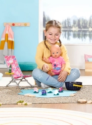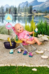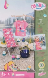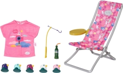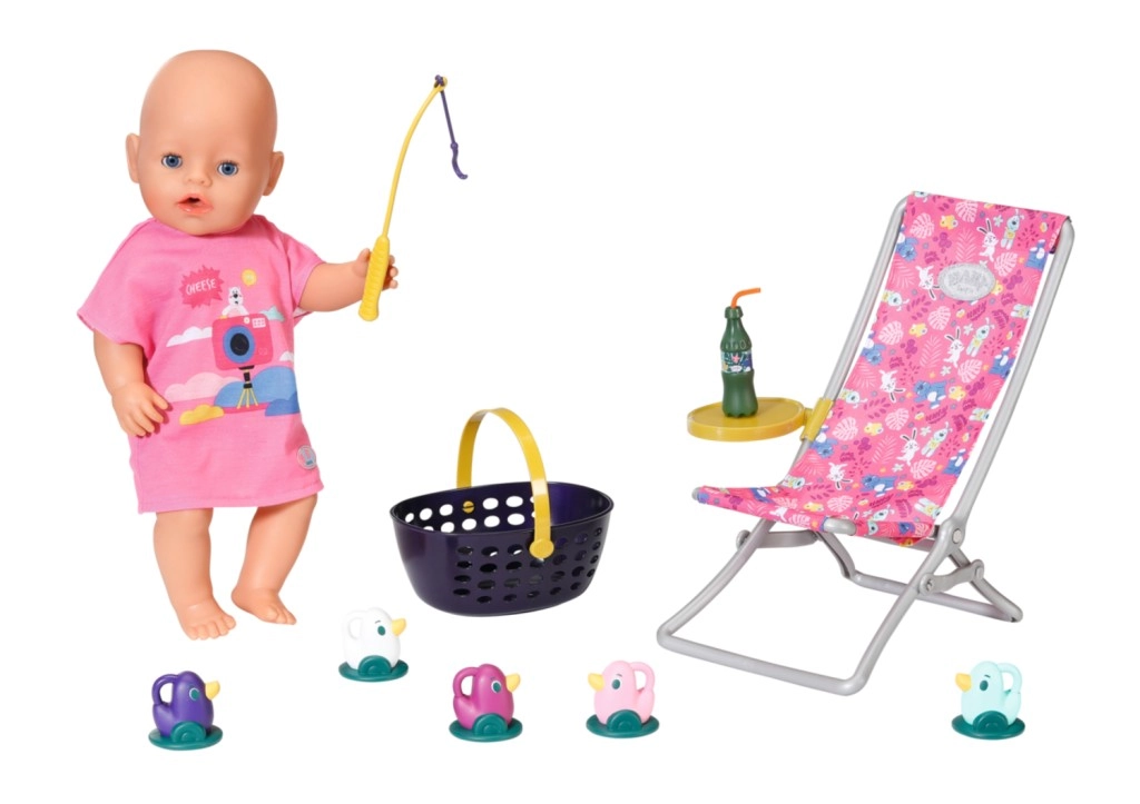 BABY born Vikend set za pecanje sadrži odjeću, ležaljku sa stolićem, bocu limunade, košaricu, 5 pačića i štap za pecanje.