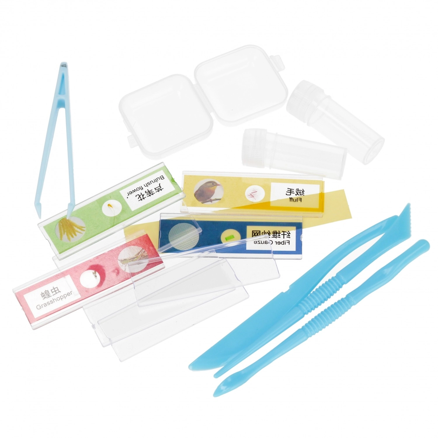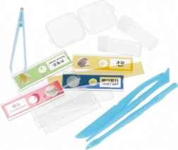 Mikroskop, 1× pinceta, 3× nožići/pripremne pločice, 2× epruvete, 1× kutijica, 4× istraživačke šablone s crtežima, 4× šablone, upute