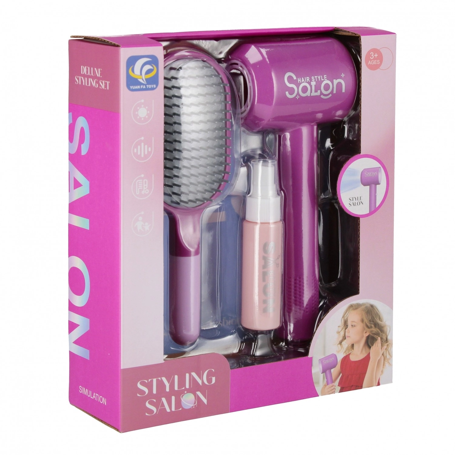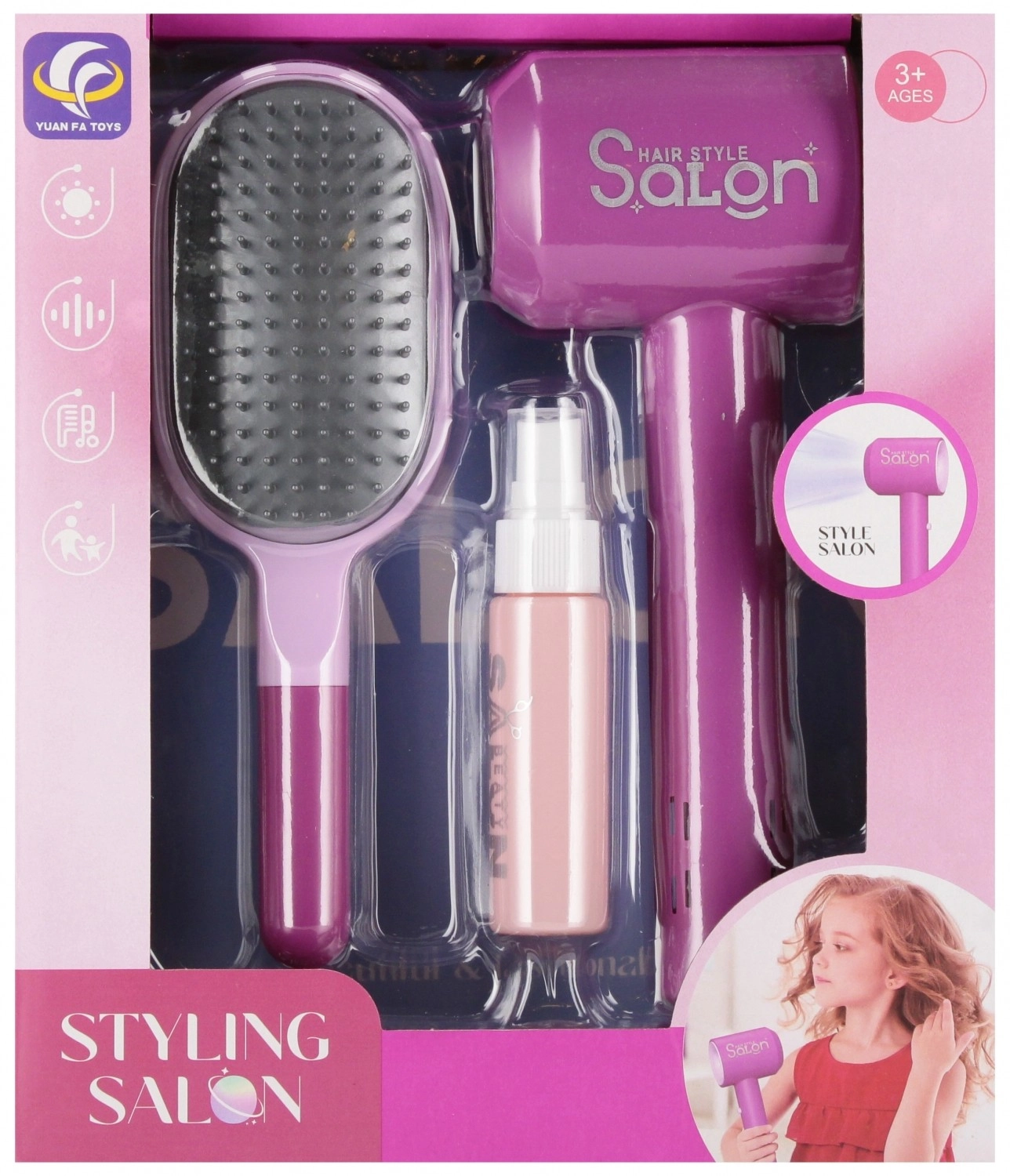 Preslatki frizerski set razveselit će sve male stilistice! Sadrži igrački fen na baterije sa zvučnim efektima, četku i češalj, sprej i druge dodatke za realističnu igru frizerskog salona. Djeca razvijaju kreativnost, maštu i finu motoriku. Preporučeno od 3 godine.