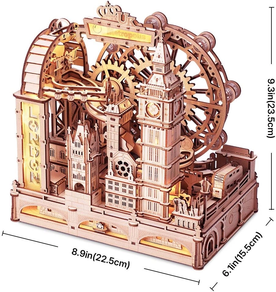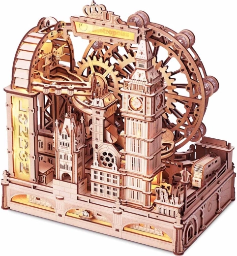 Otkrijte kultne londonske znamenitosti u obliku elegantnih 3D drvenih puzzli. Model kombinira Big Ben, Tower Bridge i London Eye s dinamičnom kugličnom stazom, gdje metalne kuglice jure rampama i tunelima zahvaljujući gravitaciji i snažnom motoru. Ne nedostaju ni simbolične Krunske dragocjenosti – sve s naglaskom na preciznu izradu.