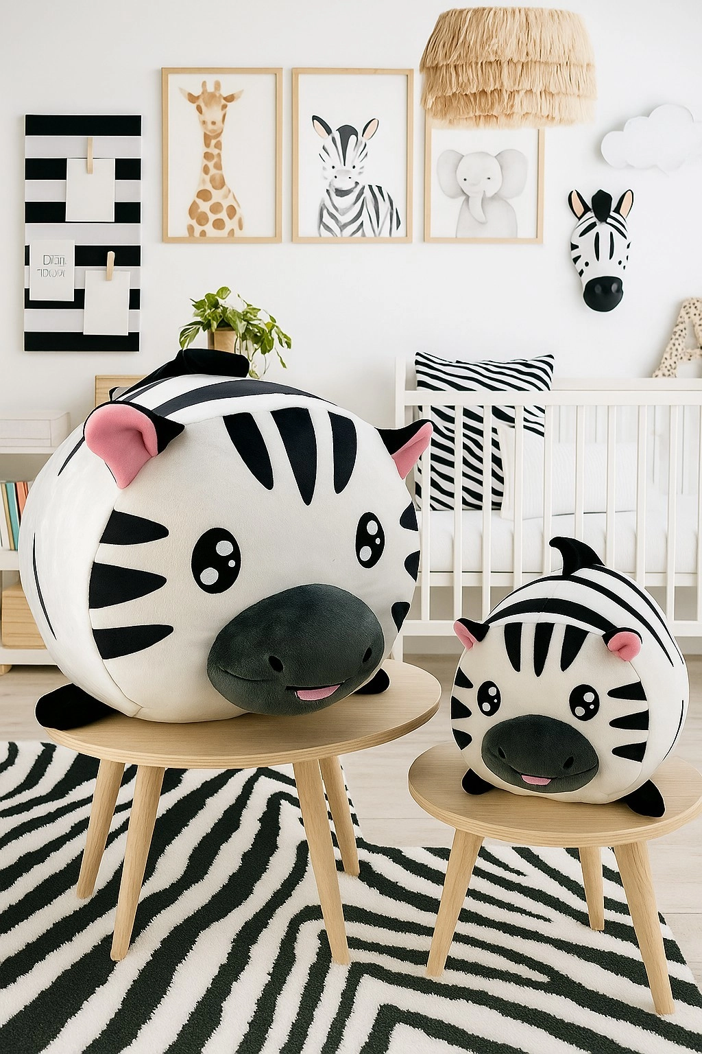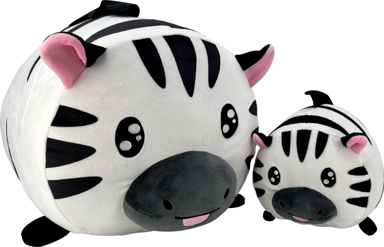 Set plišanih zebra veličine 20 cm i 40 cm razveselit će djecu svih uzrasta. Mekani pliš, slatki detalji i obli oblici jednostavno pozivaju na maženje. Manja zebra je izvrsna za kolica ili krevetić, a veća pruža potporu kao jastučić za auto ili kauč.