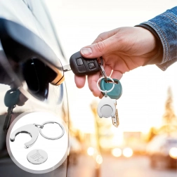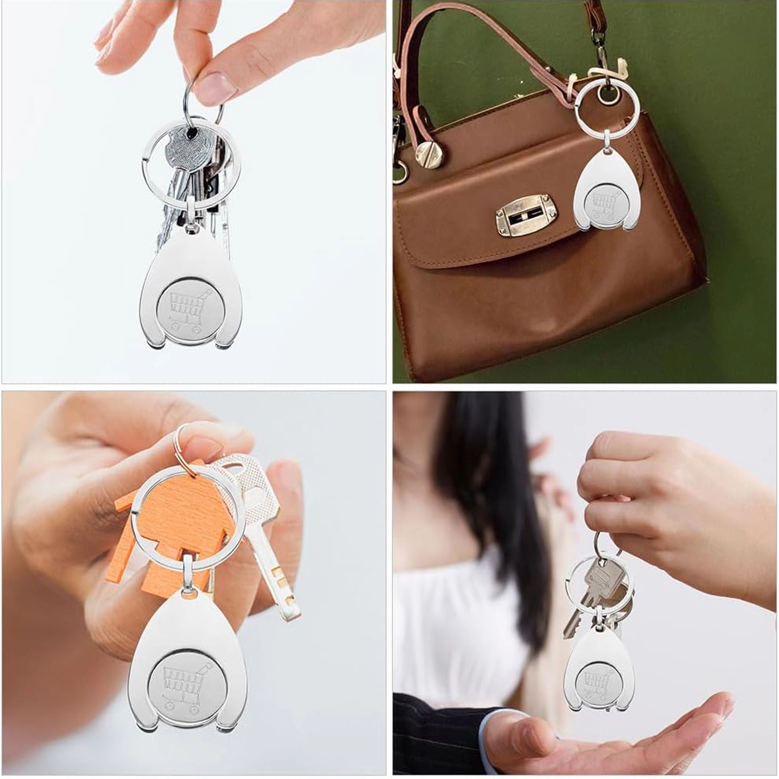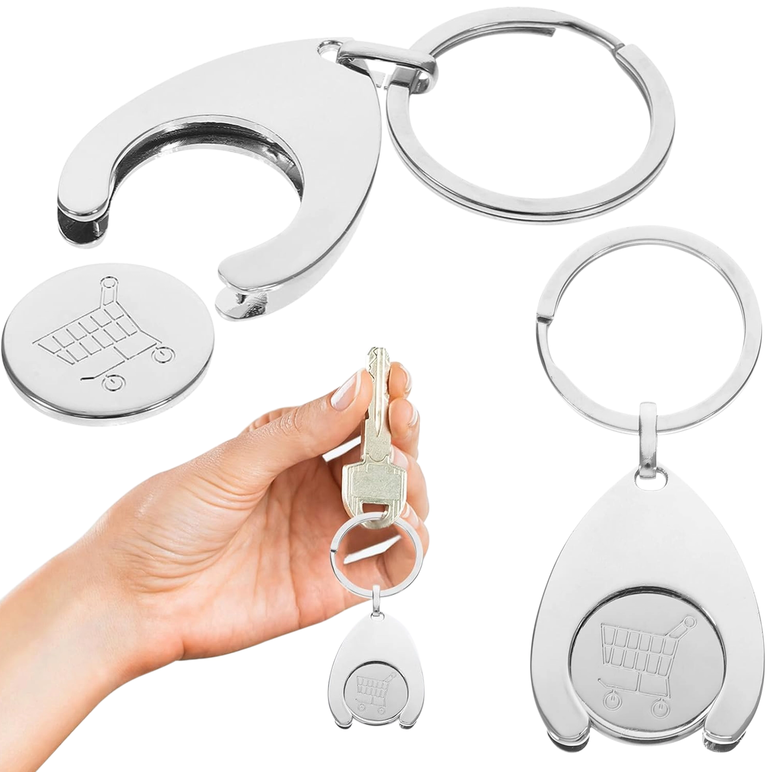 Pametno rješenje 2-u-1: elegantni metalni privjesak s izvadivim žetonom za oslobađanje kolica za kupnju. Zahvaljujući čvrstom prstenu lako ga pričvrstite na ključeve, torbu ili ruksak i imate brz pristup kolicima bez kovanica.