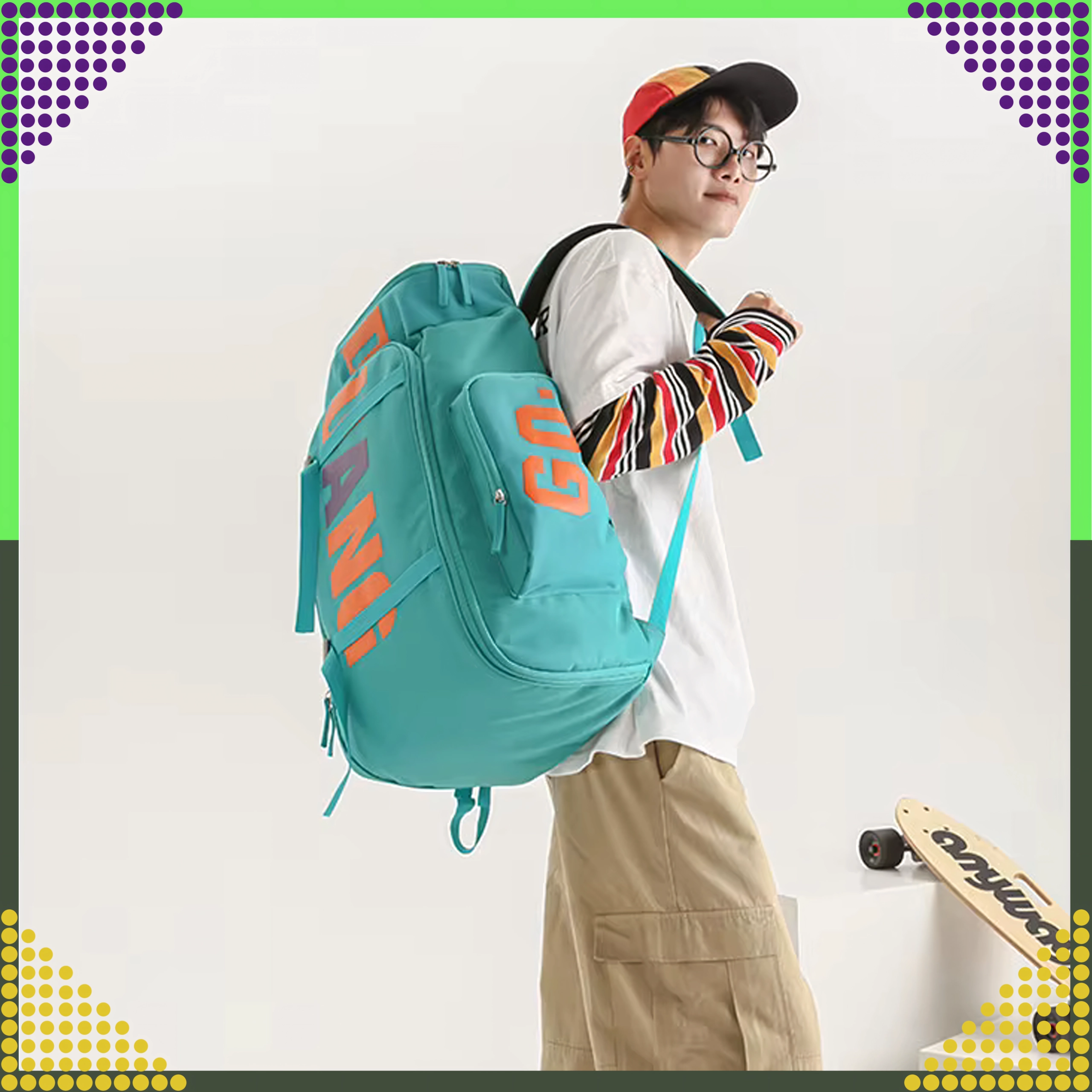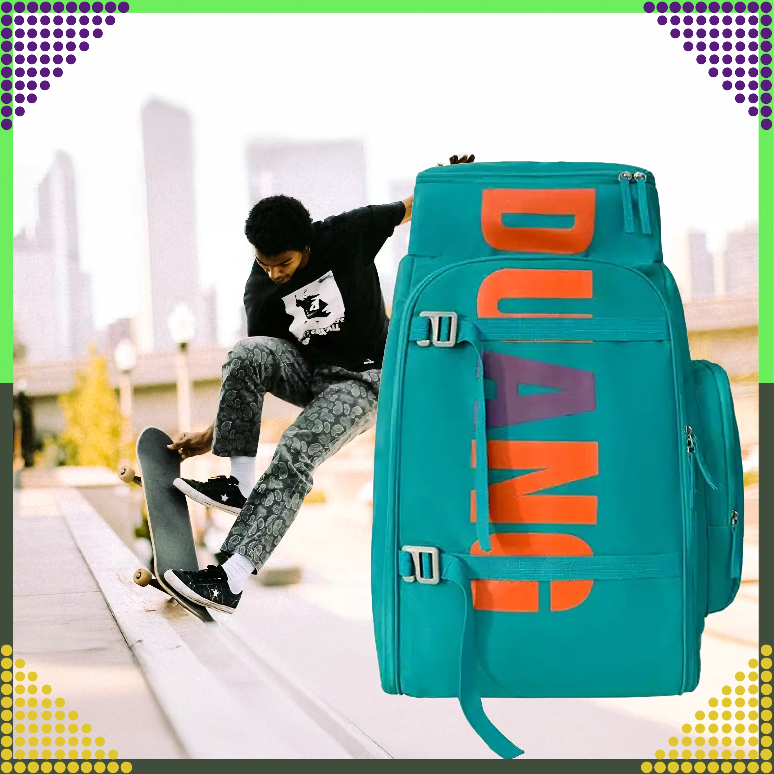 Prostran i izdržljiv ruksak za mlade skejterice i skejtere s kapacitetom 55 l nudi čvrstu konstrukciju, praktične džepove i udobnost za svaki dan. Odlično se uklapa u školu, na izlete i za vožnju na skateboardu.