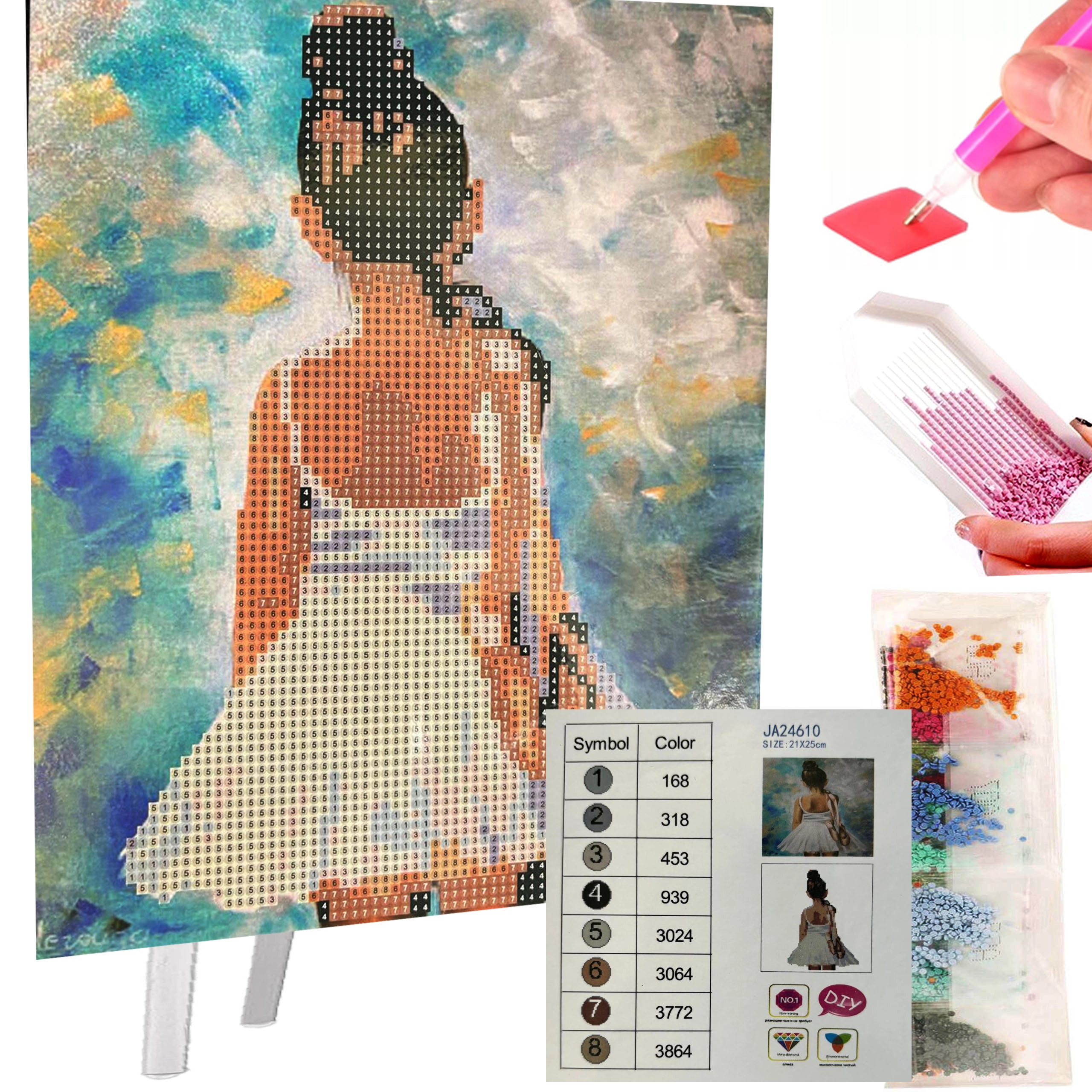 Otkrijte čaroliju dijamantne mozaike – jednostavan i umirujući način za stvaranje blistavih sličica korak po korak. Set sadrži sve potrebno za odmah započeti: platno s predloškom, sjajne kamenčiće, aplikator, vosak i tacnu za pregledno razvrstavanje. Gotovu sliku lako ćete izložiti zahvaljujući bijelom stalku koji je dio pakiranja.