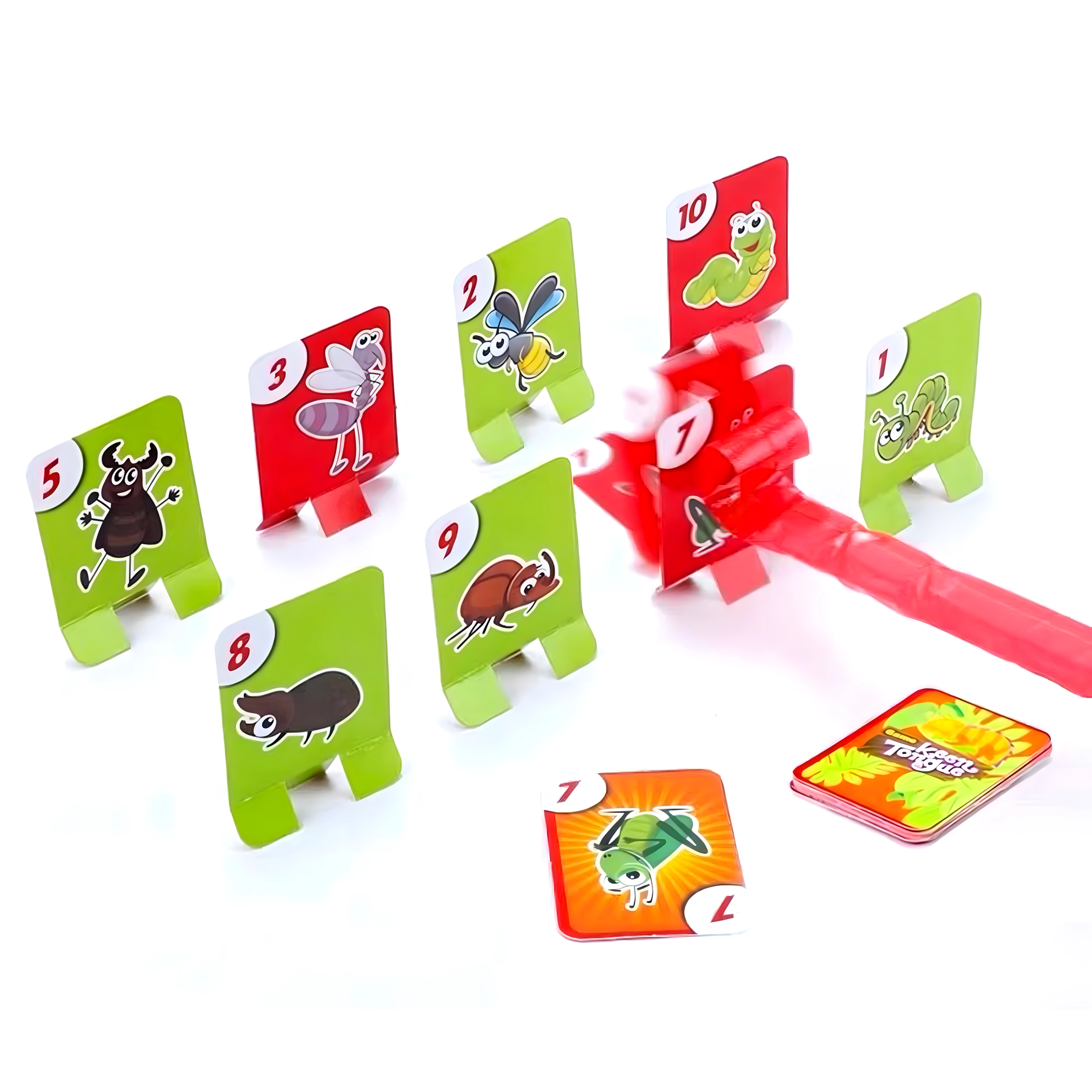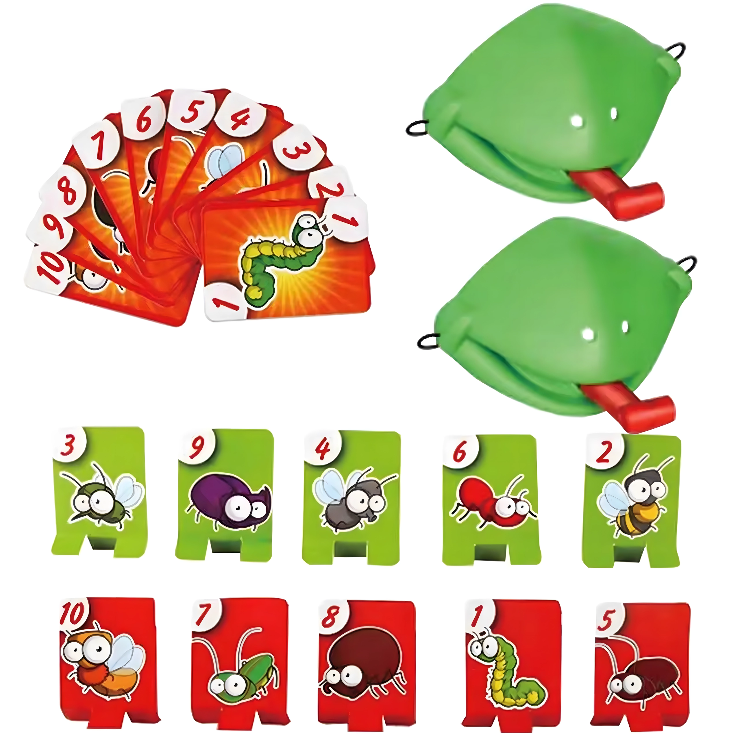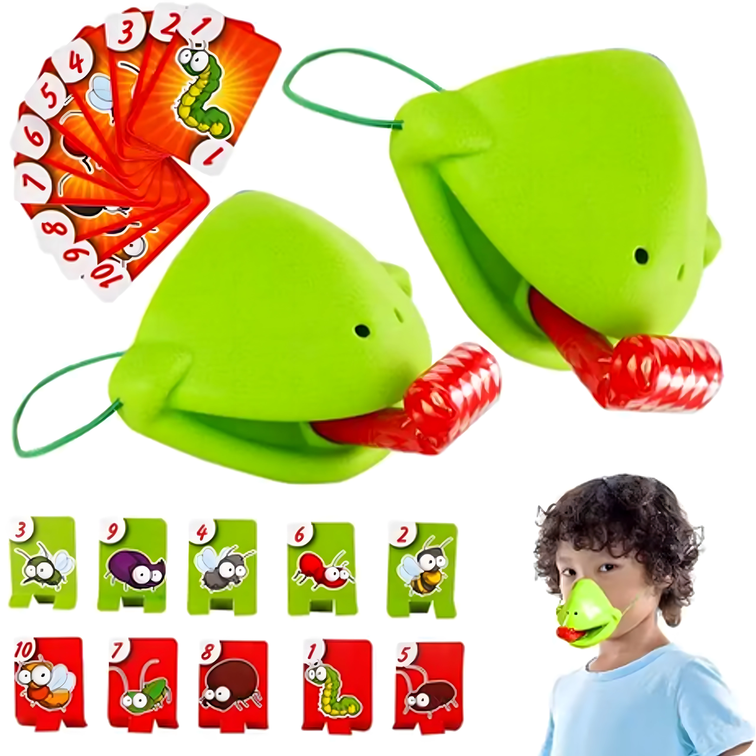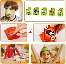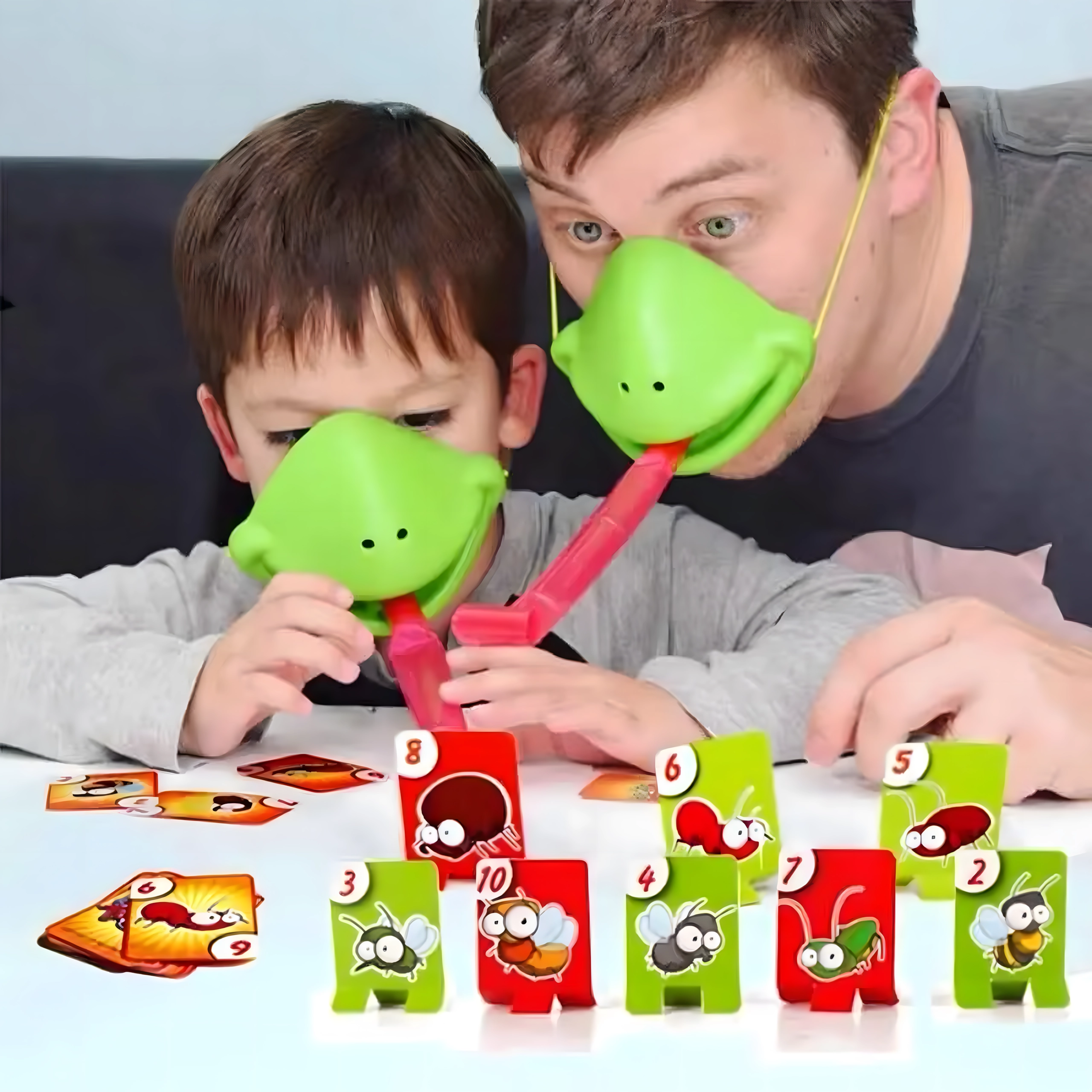 Zahvaljujući podesivim elastičnim trakama maske dobro stoje, pružni jezik osigurava dinamičnu i sigurnu igru, a šarene karte s kukcima potiču poimanje brojeva, pažnju i koordinaciju oko–ruka. Sjajno za obiteljske večeri, dječje proslave i prijateljska nadmetanja.