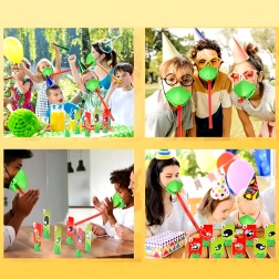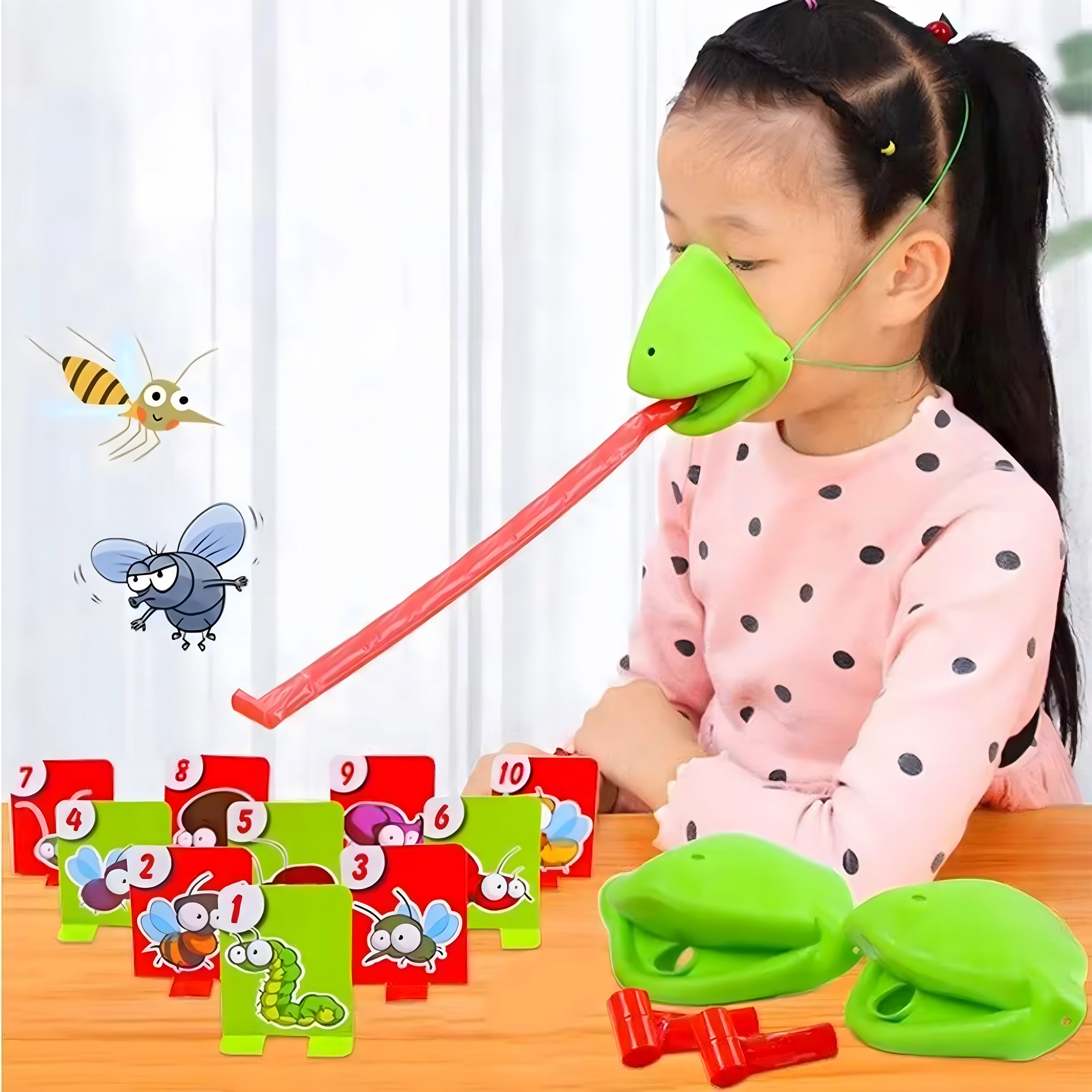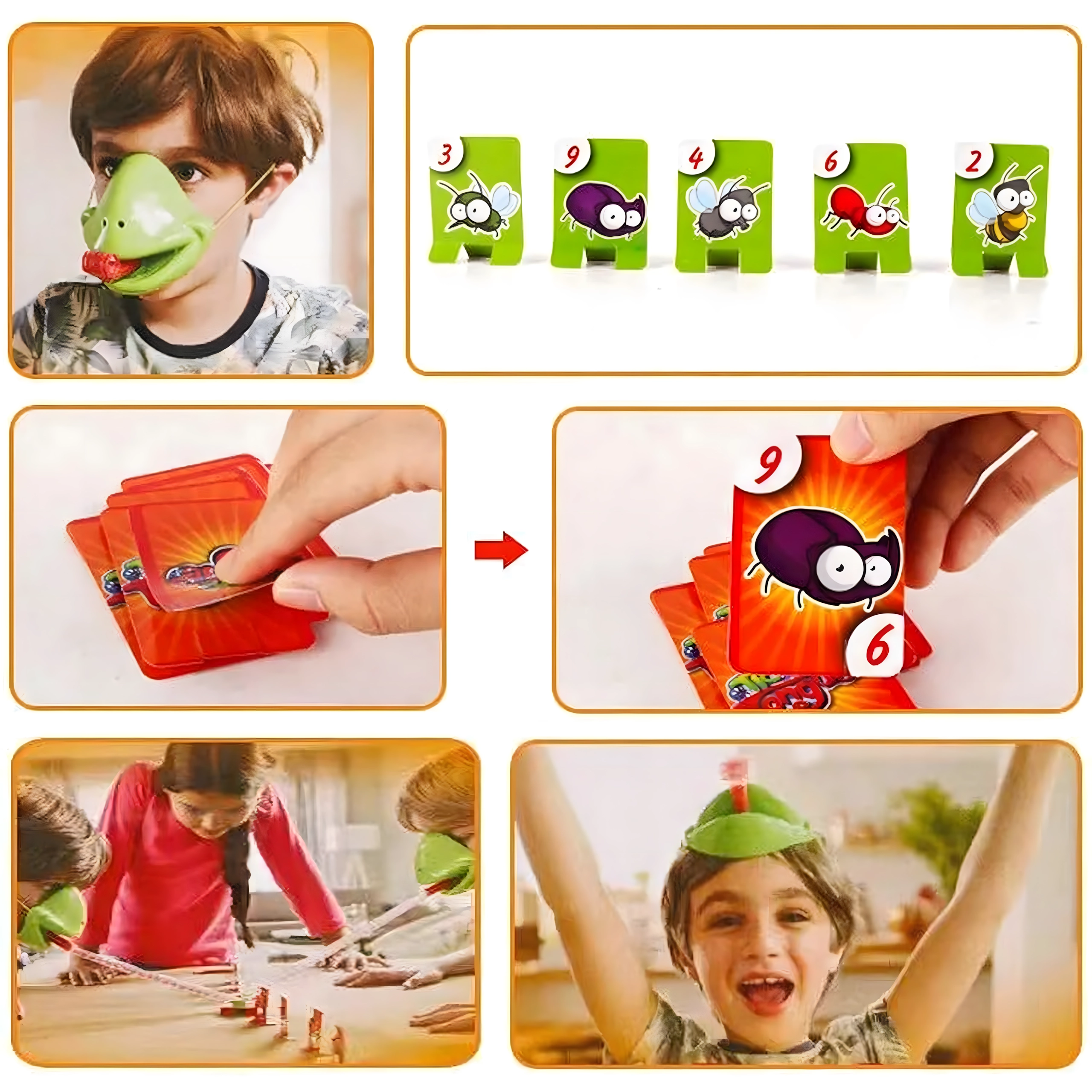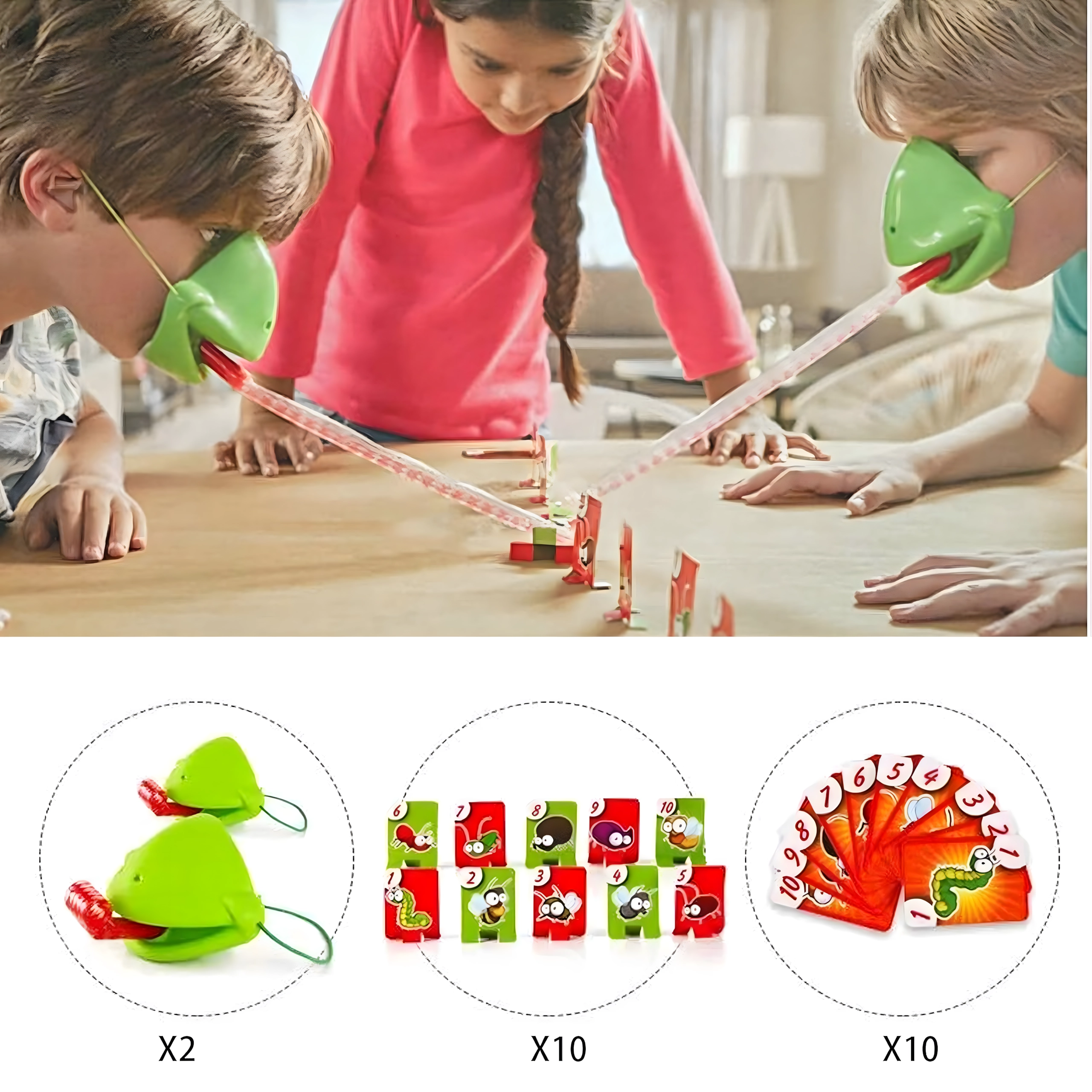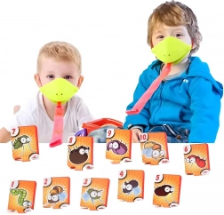 Zahvaljujući podesivim elastičnim trakama maske dobro stoje, pružni jezik osigurava dinamičnu i sigurnu igru, a šarene karte s kukcima potiču poimanje brojeva, pažnju i koordinaciju oko–ruka. Sjajno za obiteljske večeri, dječje proslave i prijateljska nadmetanja.