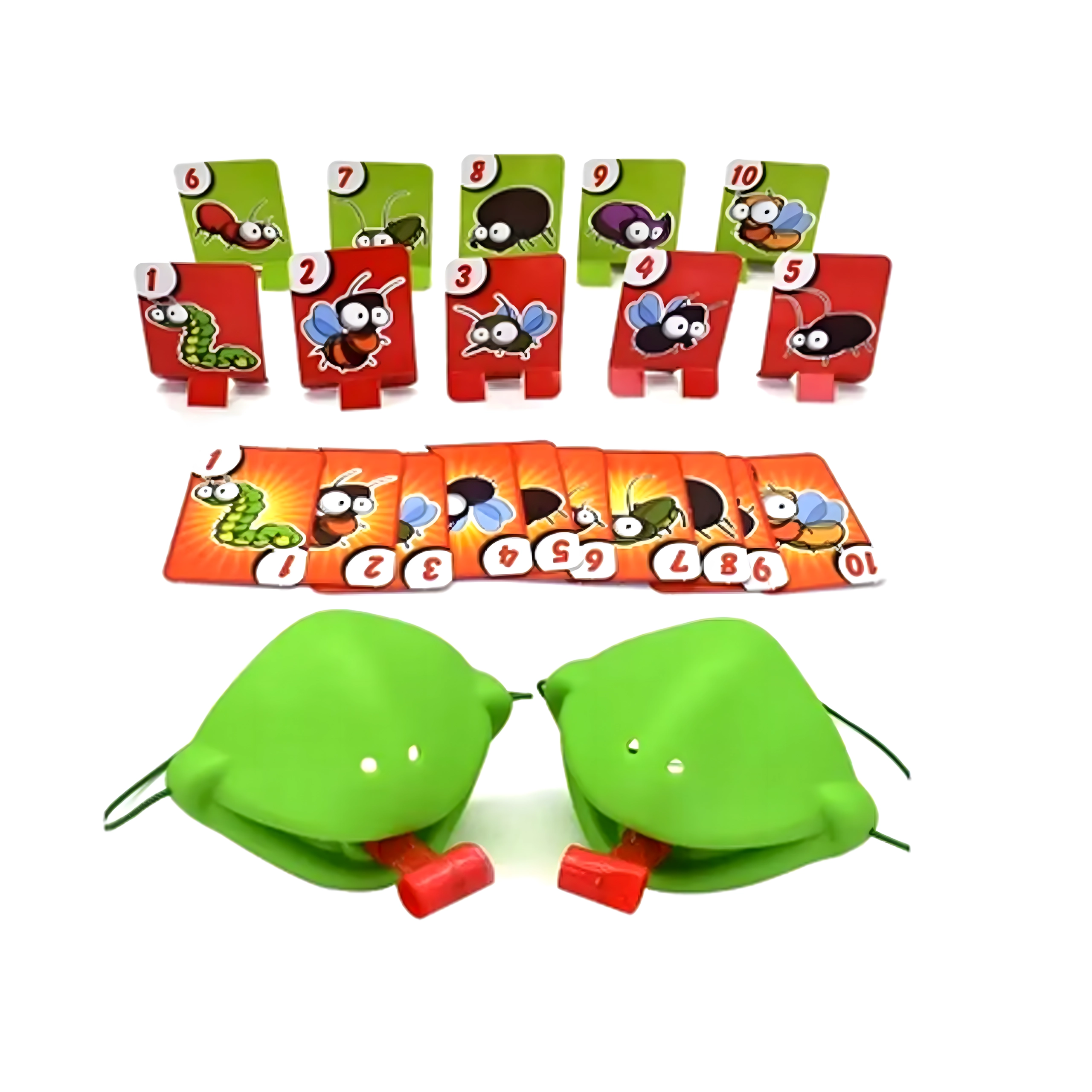 Set sadrži ilustrirane karte s brojevima i kukcima za različite načine igre – od brzog hvatanja do uparivanja i zbrajanja bodova.