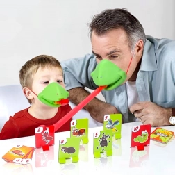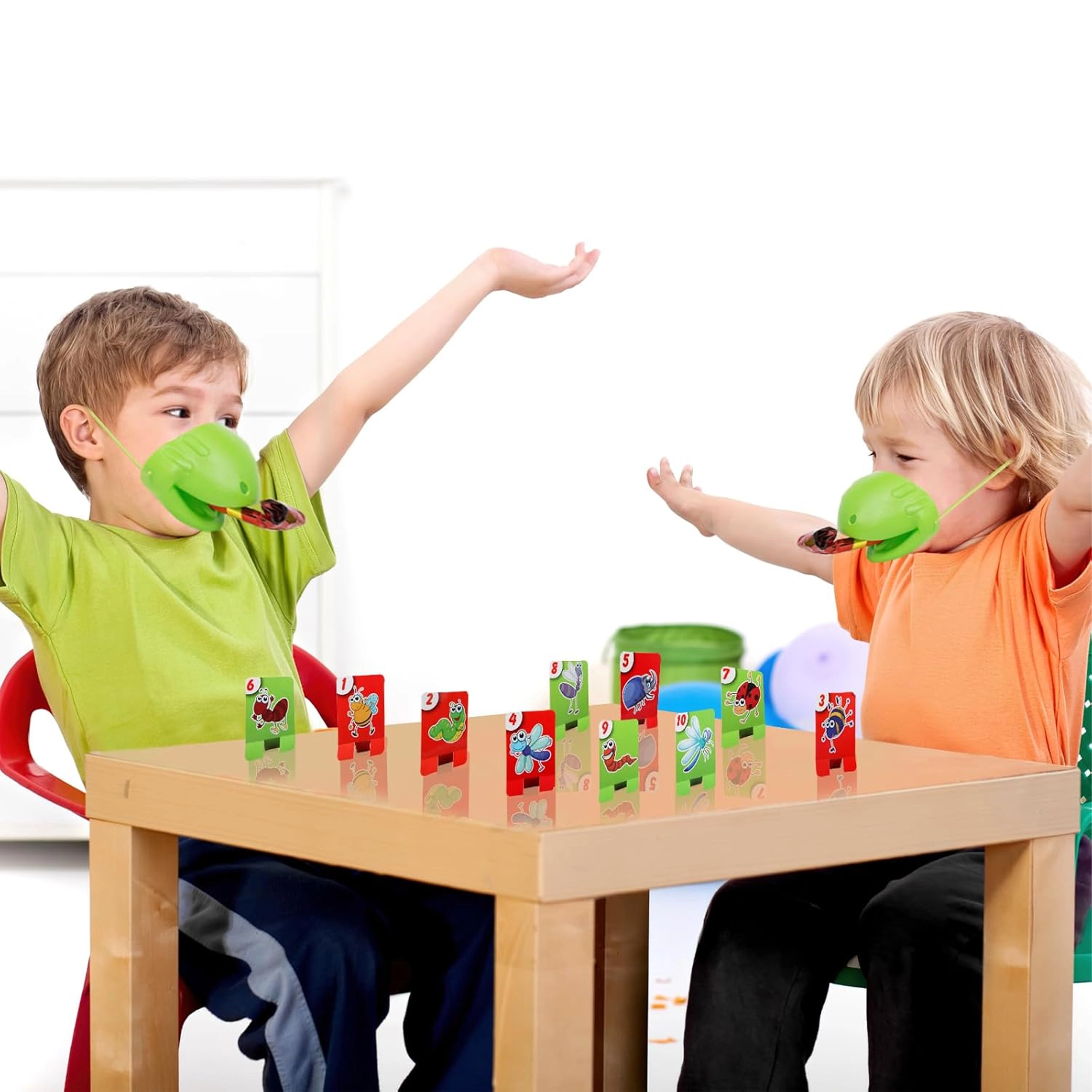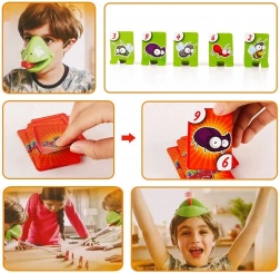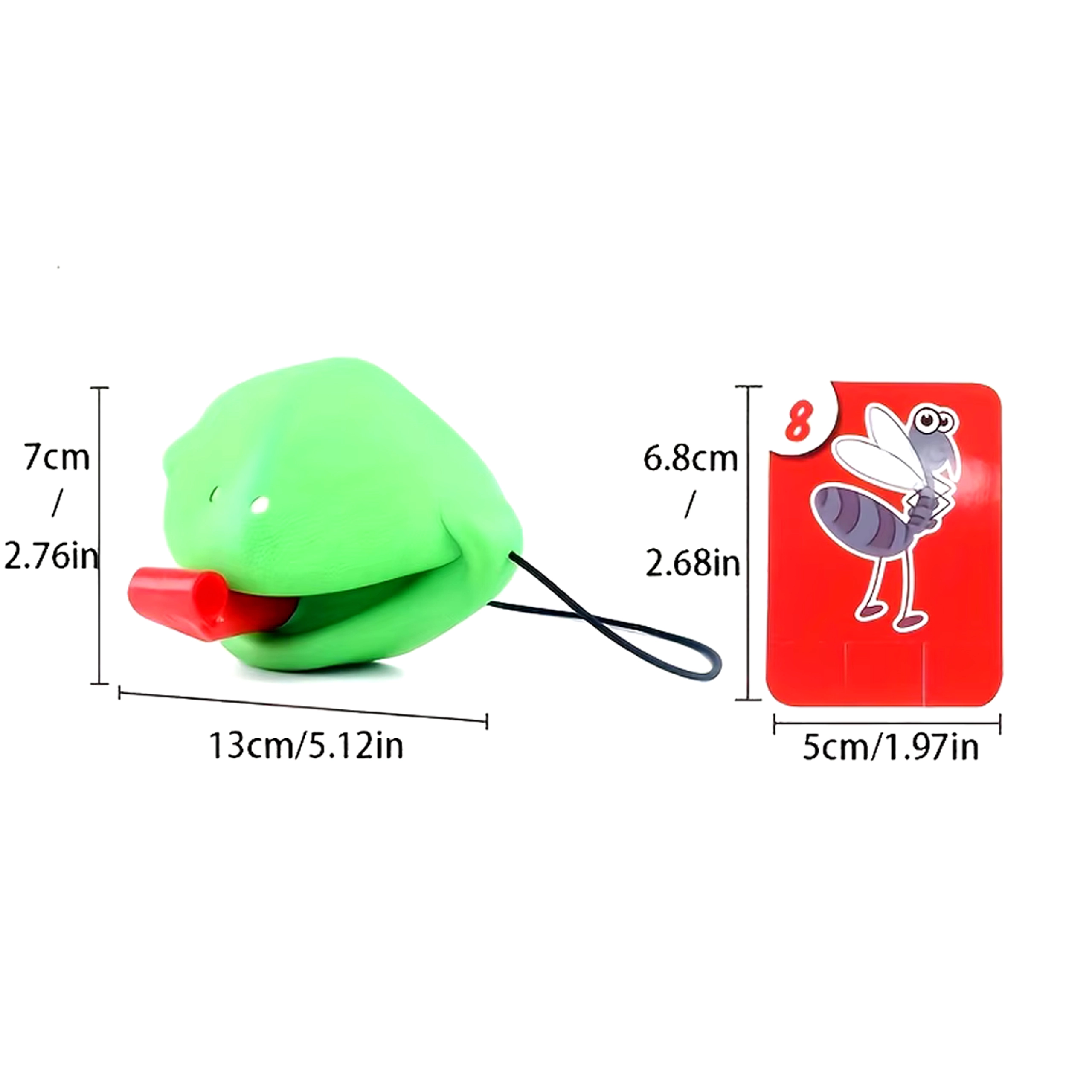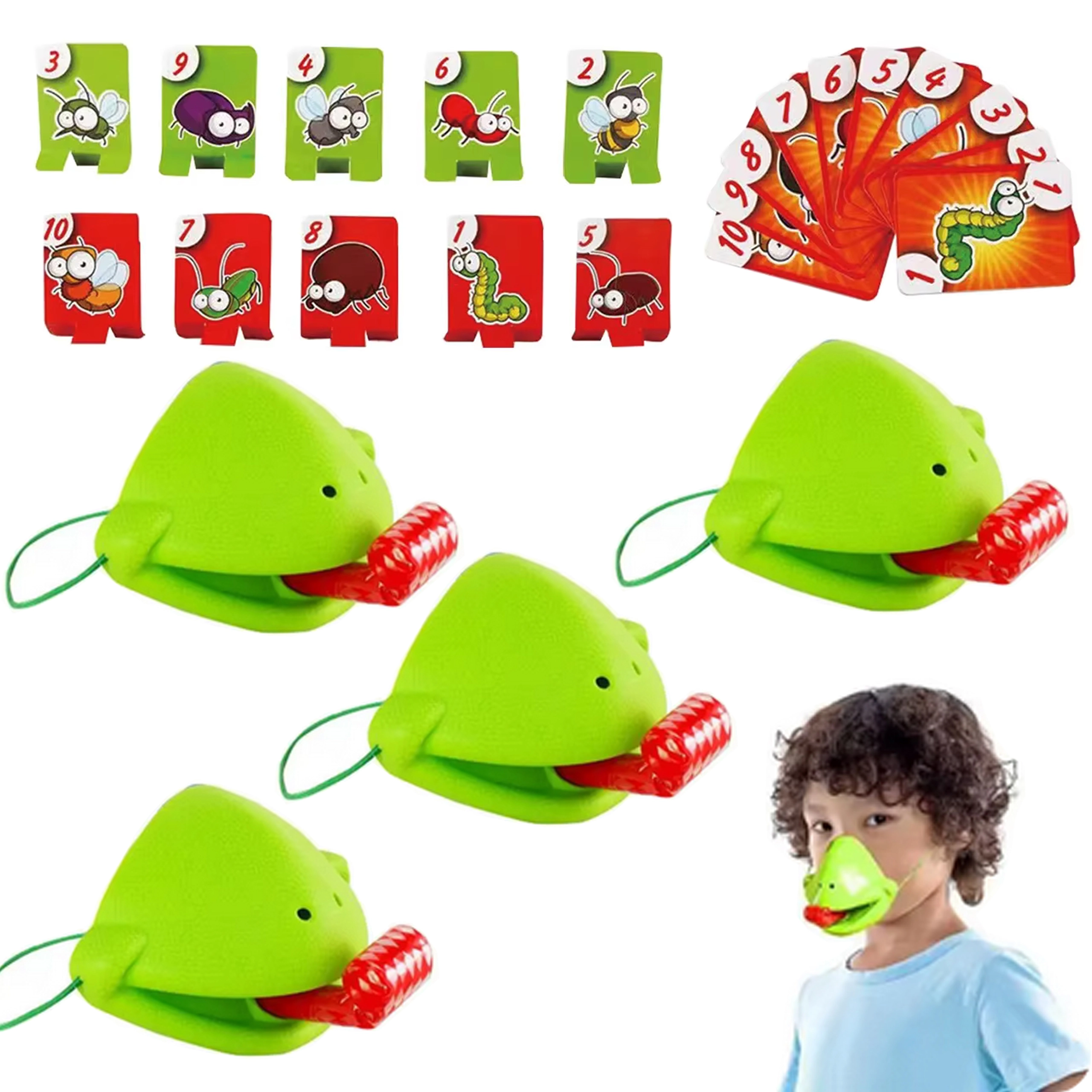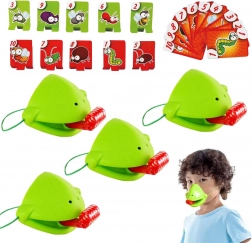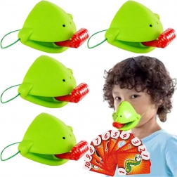 Set sadrži sve za 4 igrača: lagane žablje maske s elastičnom trakom i “jezikom” te šarene kartice. Igra potiče brze reakcije, koordinaciju oko–ruka i koncentraciju. Idealno za obiteljske večeri, dječje proslave i slobodne trenutke kod kuće.
