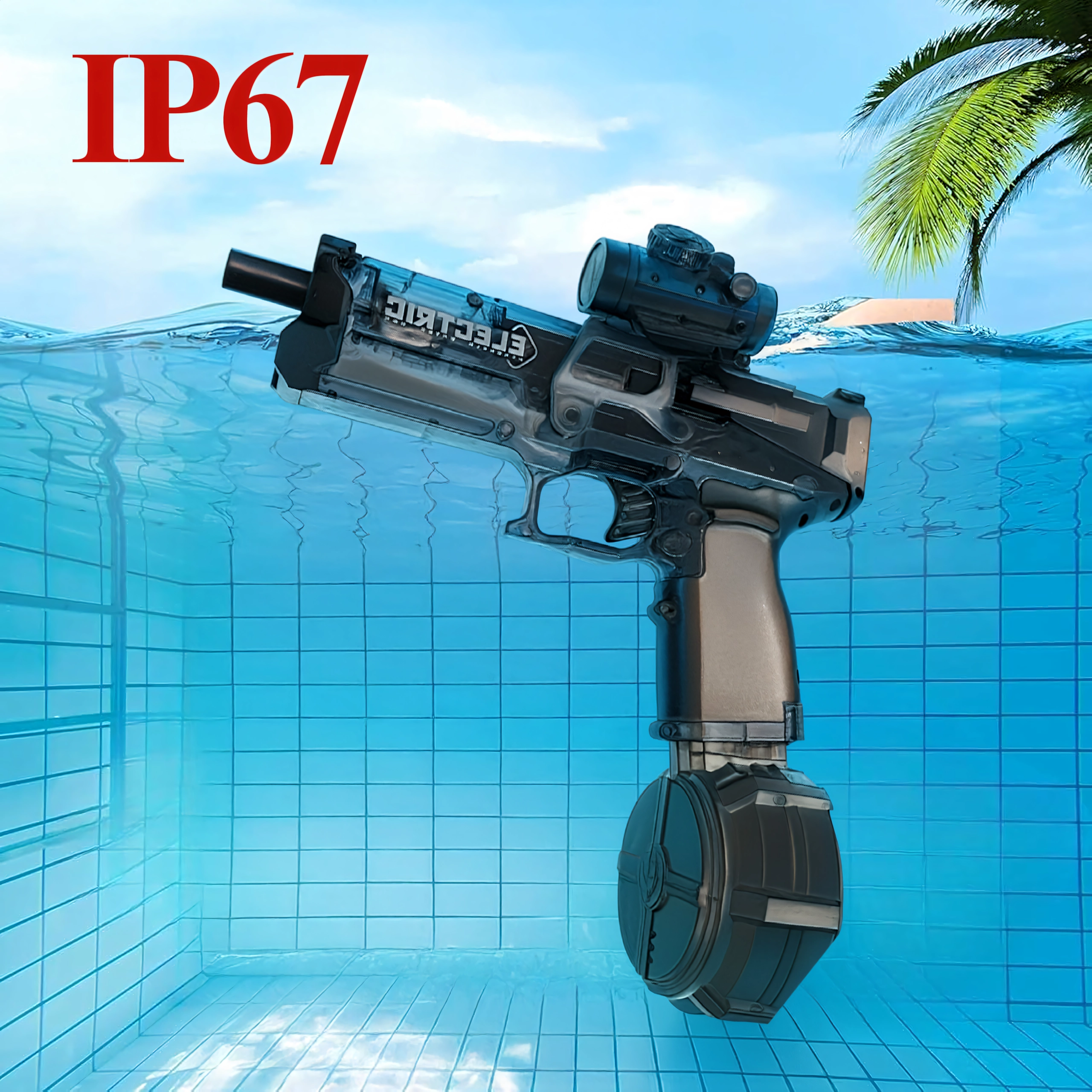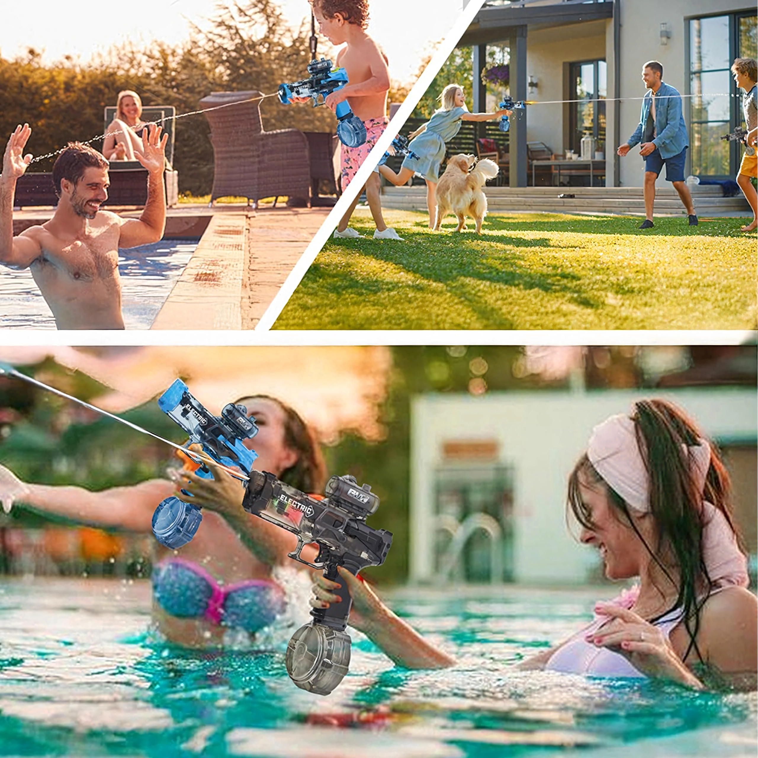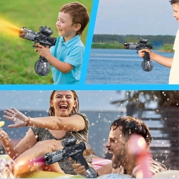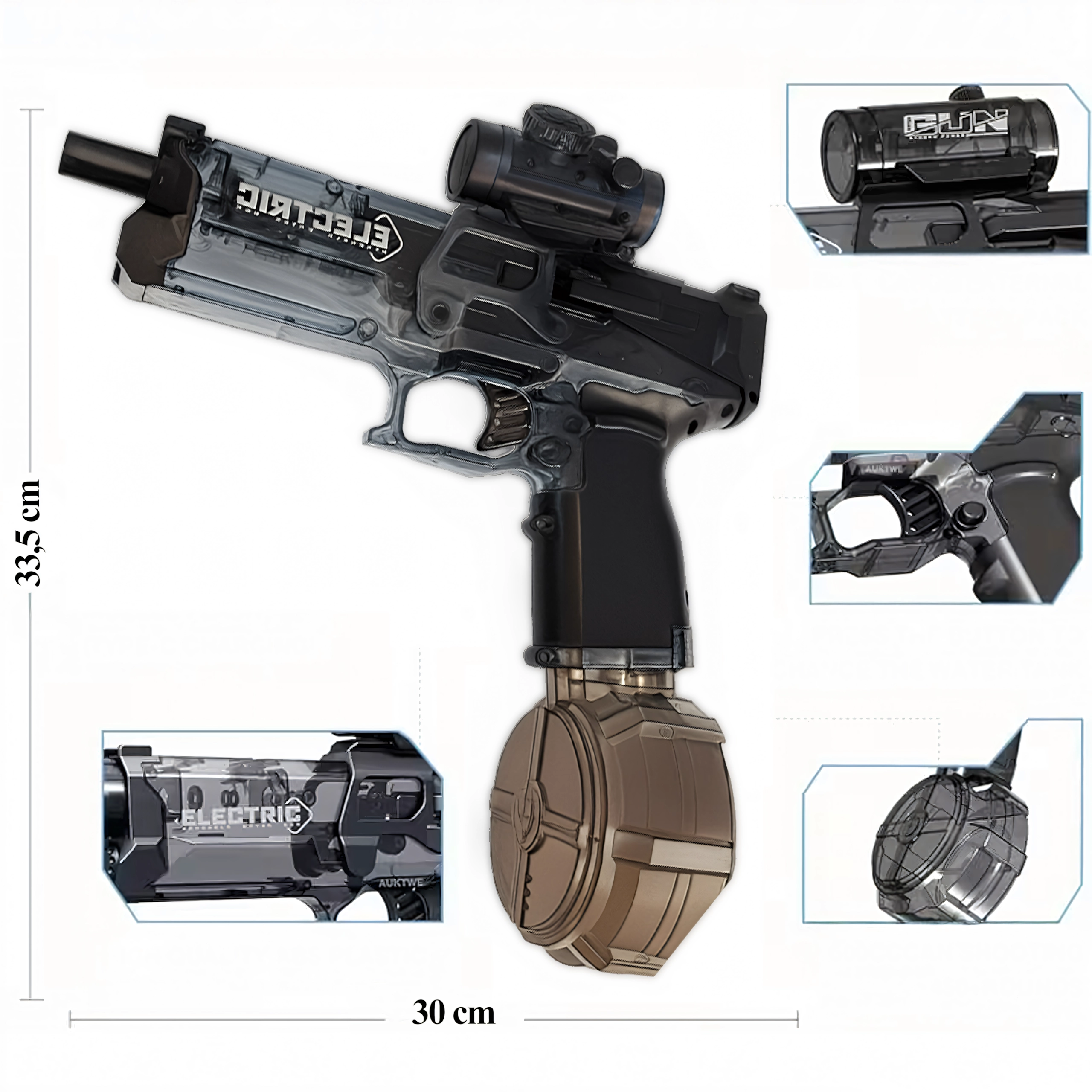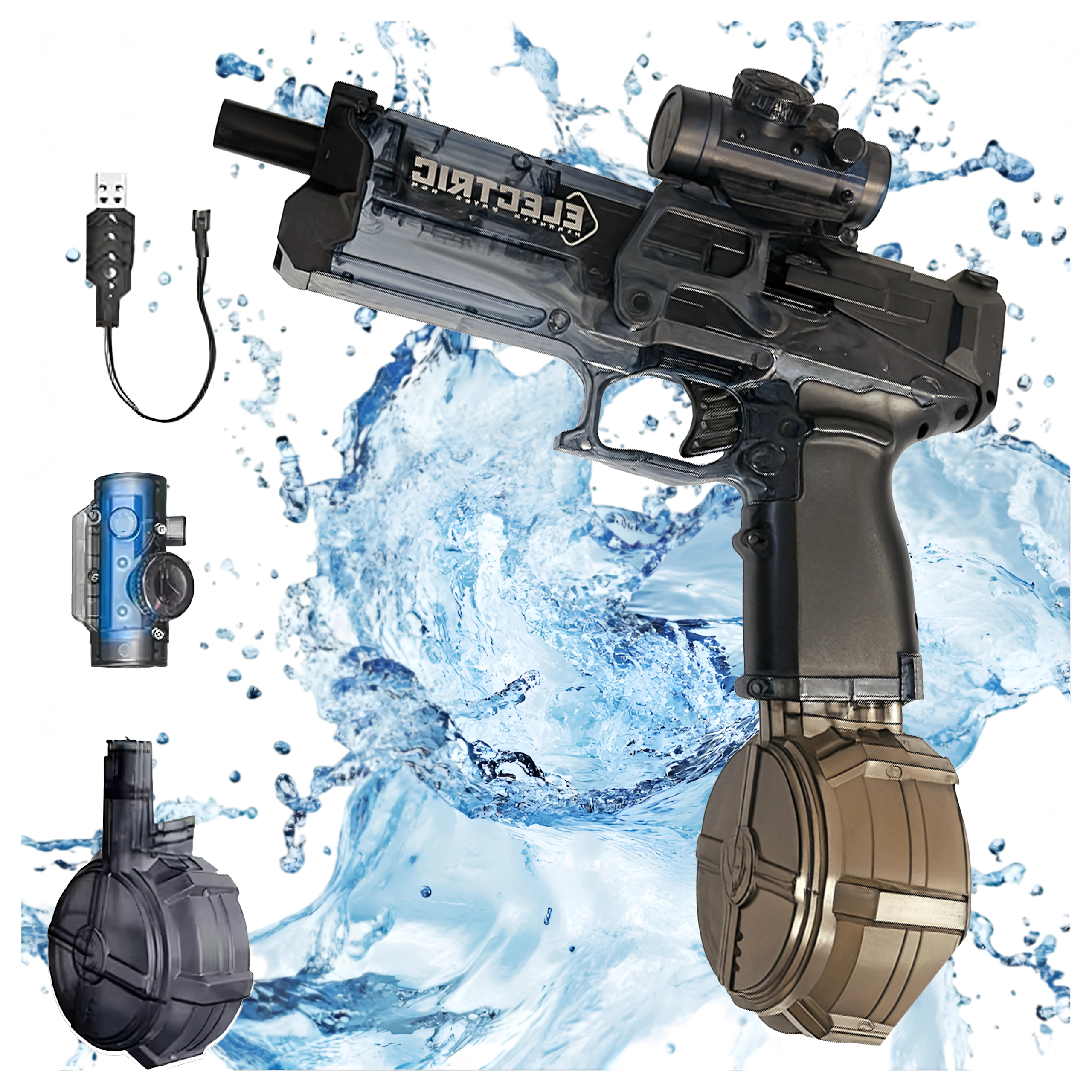 Ovaj snažan električni vodeni pištolj donosi dinamičnu i udobnu igru za djecu i odrasle. Zahvaljujući automatskom okidanju isporučuje kontinuirani mlaz vode bez potrebe za pumpanjem, dok kapacitivni spremnik osigurava rjeđe nadopunjavanje. Ugrađena punjiva baterija preko USB-a pruža do 35 minuta zabave na jedno punjenje.