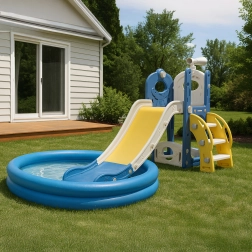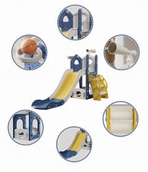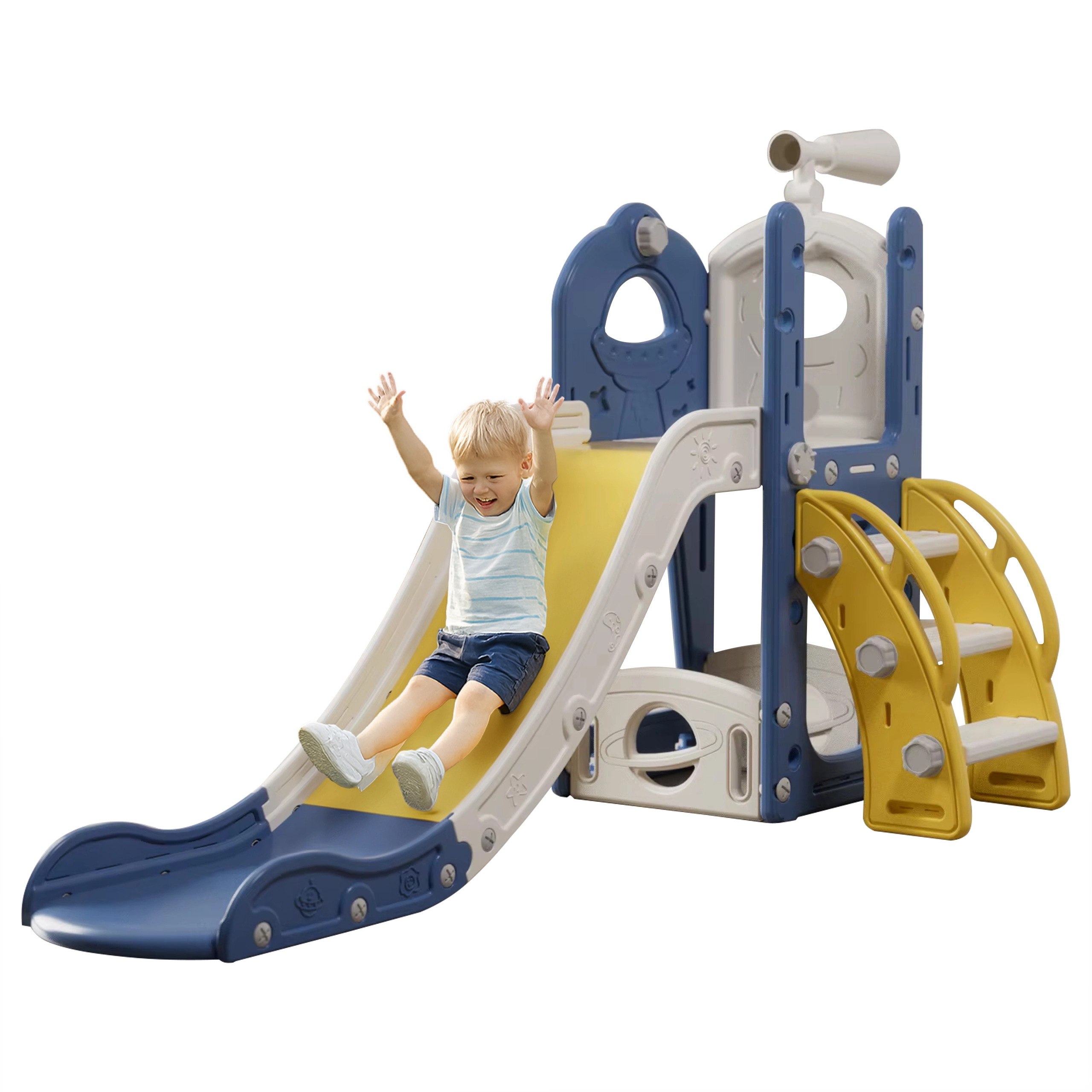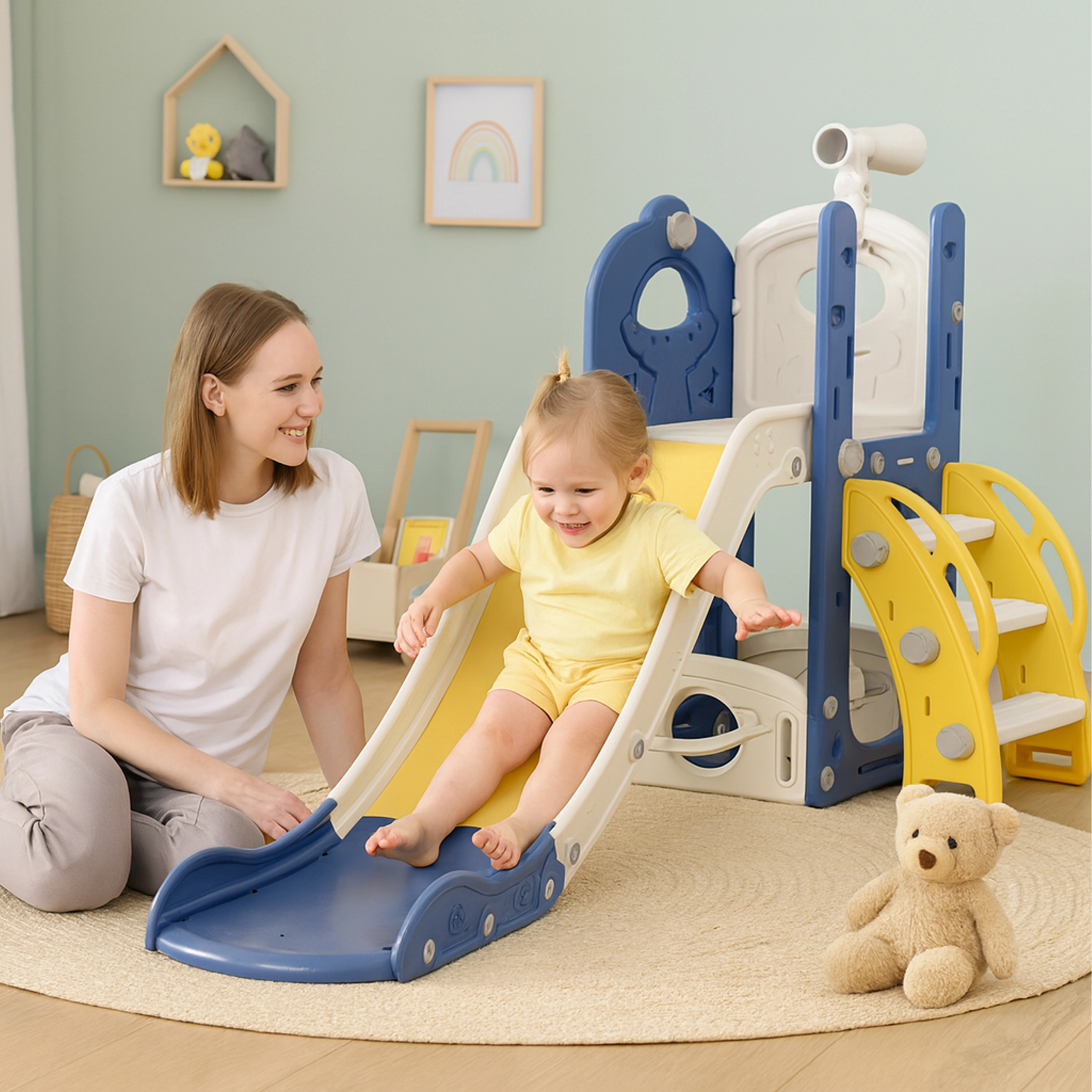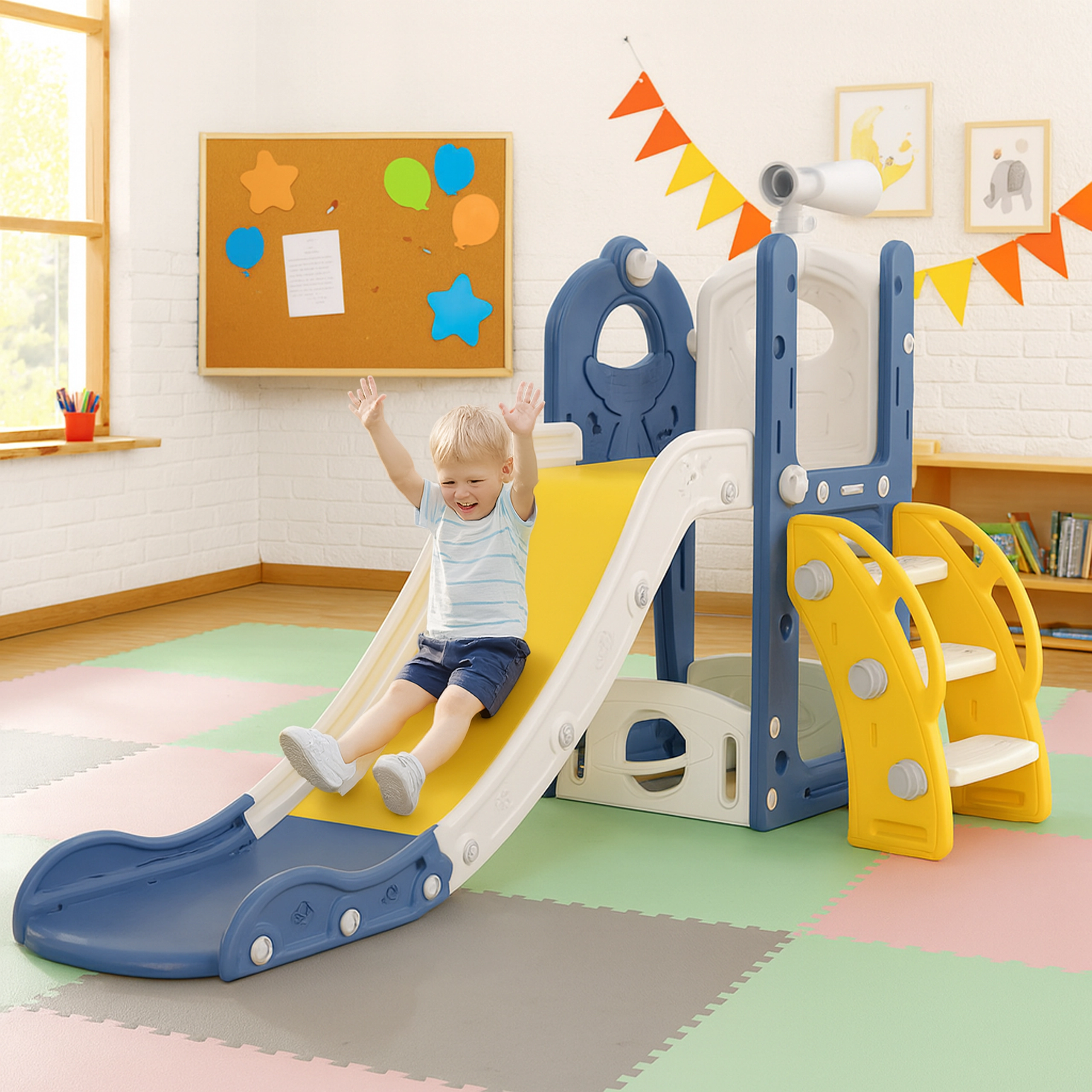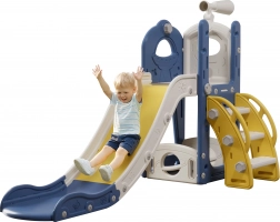 Dio seta su zabavni dodaci – koš za košarku za prve koševe i teleskop za male istraživače. Tobogan se lako održava, prikladan je za svakodnevnu igru i zahvaljujući kompaktnim dimenzijama možete ga smjestiti u dnevni boravak, dječju sobu ili na terasu. Odlično će poslužiti i uz suhi bazen s lopticama.