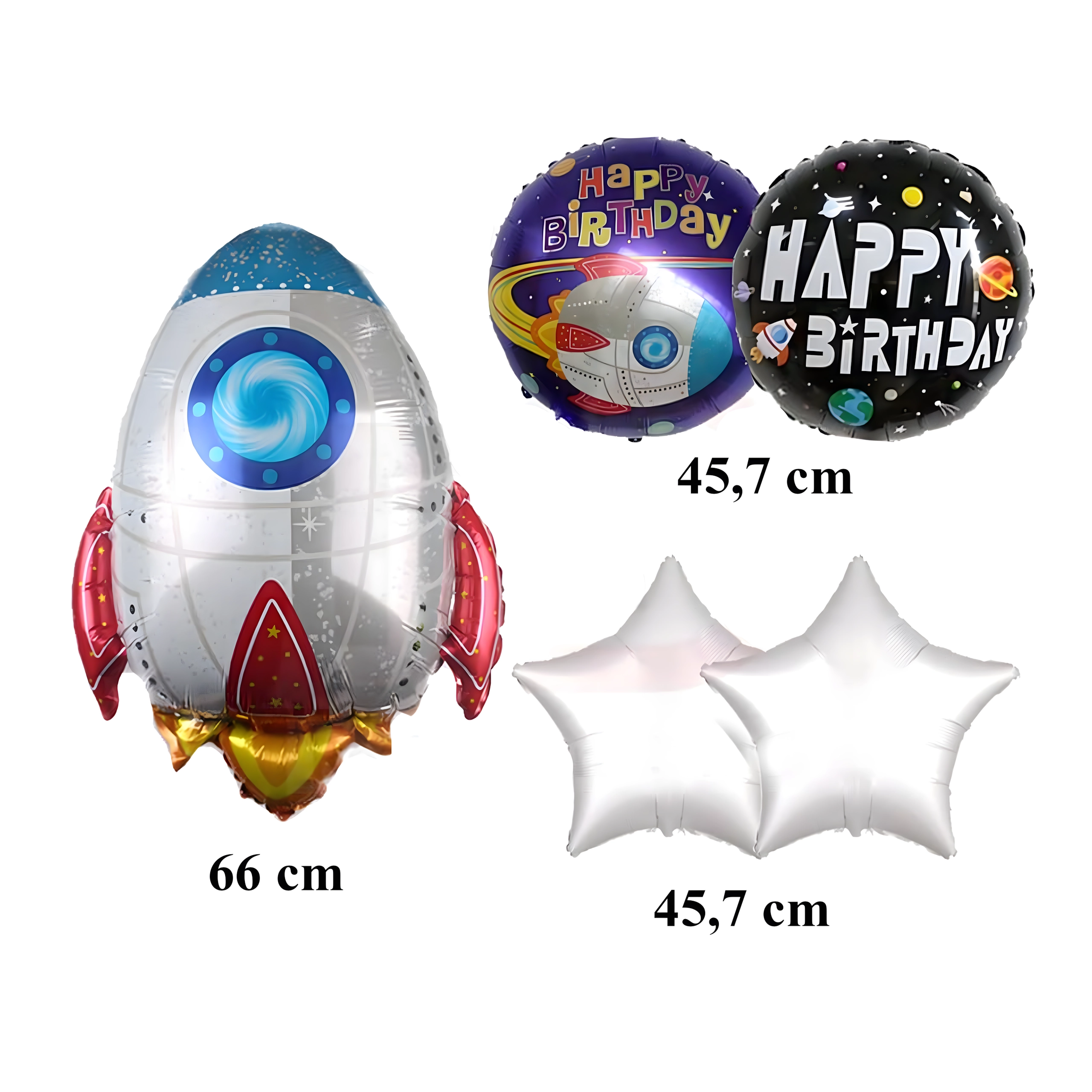 Otkrijte zabavu u svemirskom stilu! Ovaj set sadrži 5 folijskih balona u obliku astronauta, rakete i zvjezdica, idealnih za rođendanske proslave, tematske partyje i kao ukras za dječju sobu. Odlično odgovara i za fotokutak i stylish fotografije.