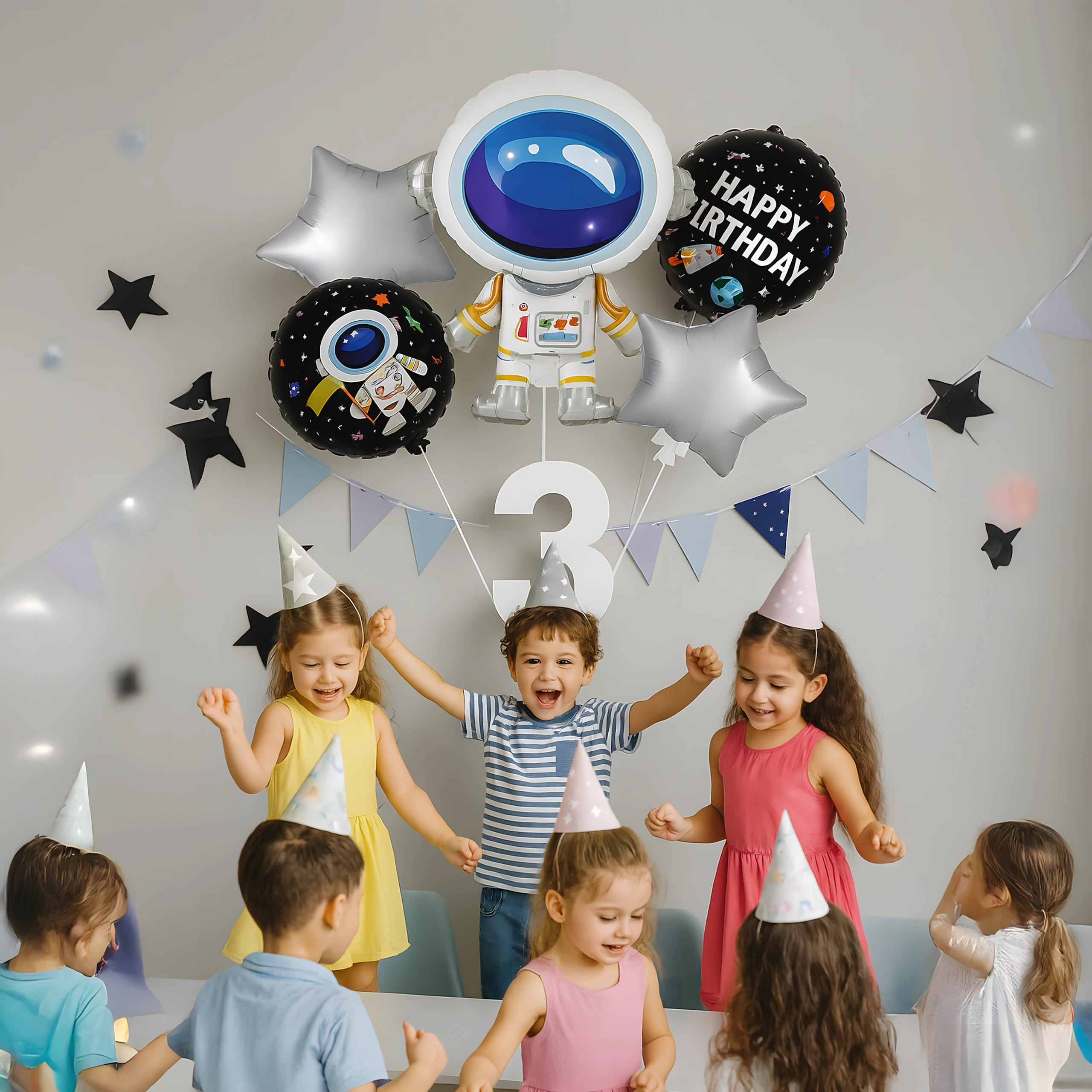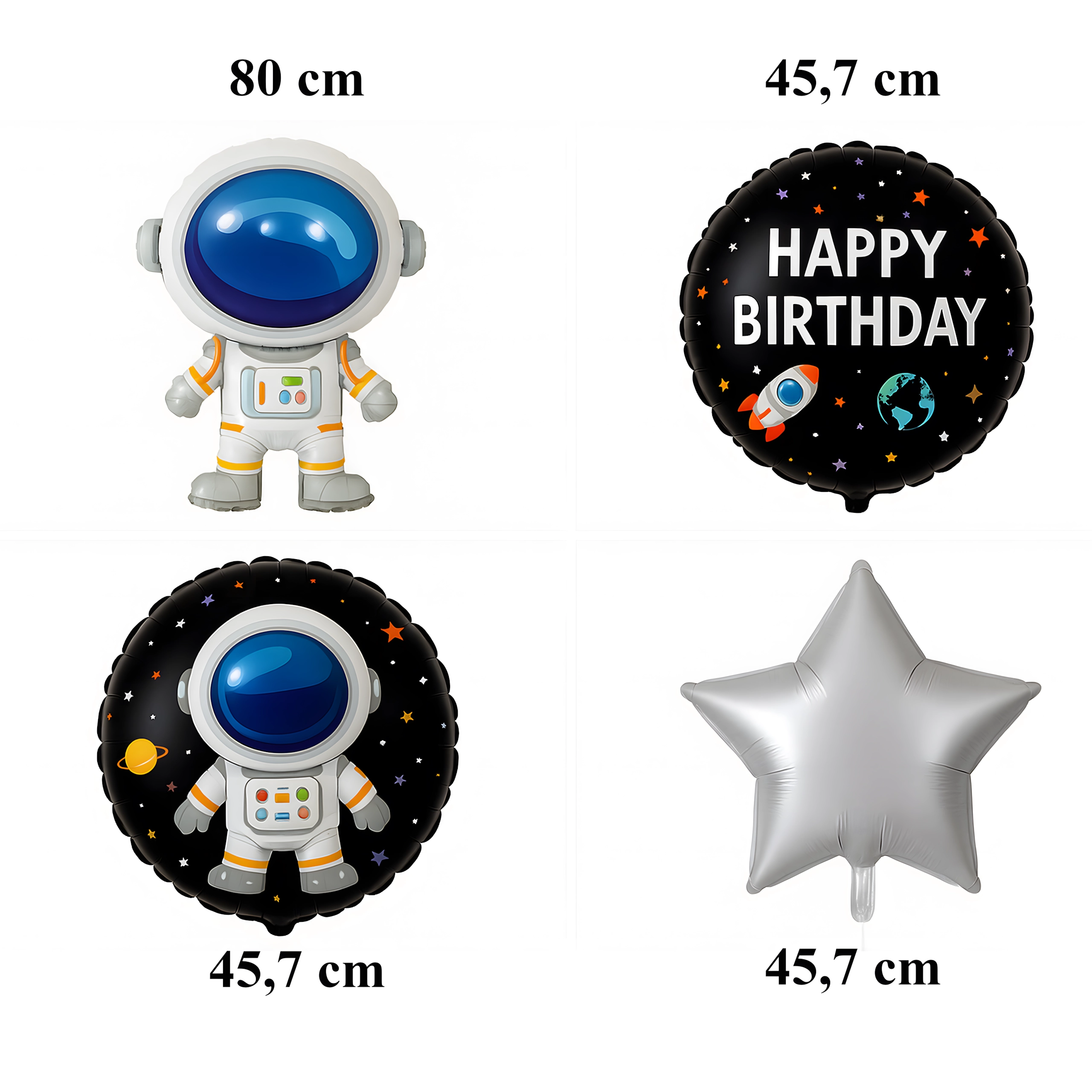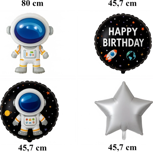 Stilski set folijskih balona s motivom svemira sadrži astronauta i zvjezdice, idealno za rođendane, tematske zabave i kao dekoracija za dječju sobu. Odlično i za foto kutak i nezaboravne proslave.