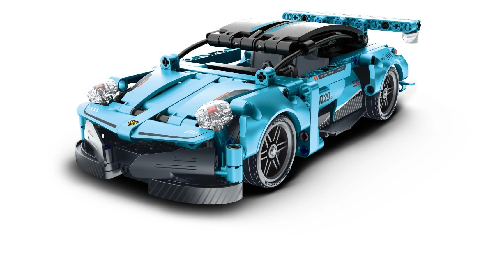 Otkrijte radost slaganja i igre u jednom pakiranju. Od 293 dijela složit ćete dva različita modela – glatko cestovno coupé za stilsku vožnju ili agresivniji trkaći automobil s izraženim aerodinamičnim krilom. Oba modela imaju funkcionalne kotače, detaljnu karoseriju i efektan spoj plave i crne boje.