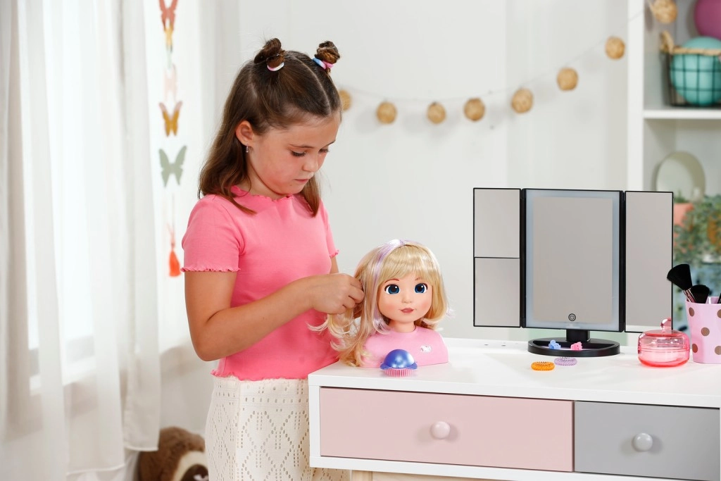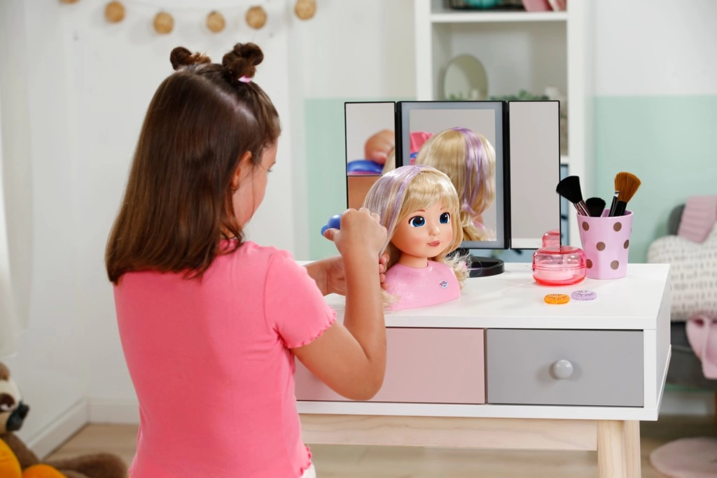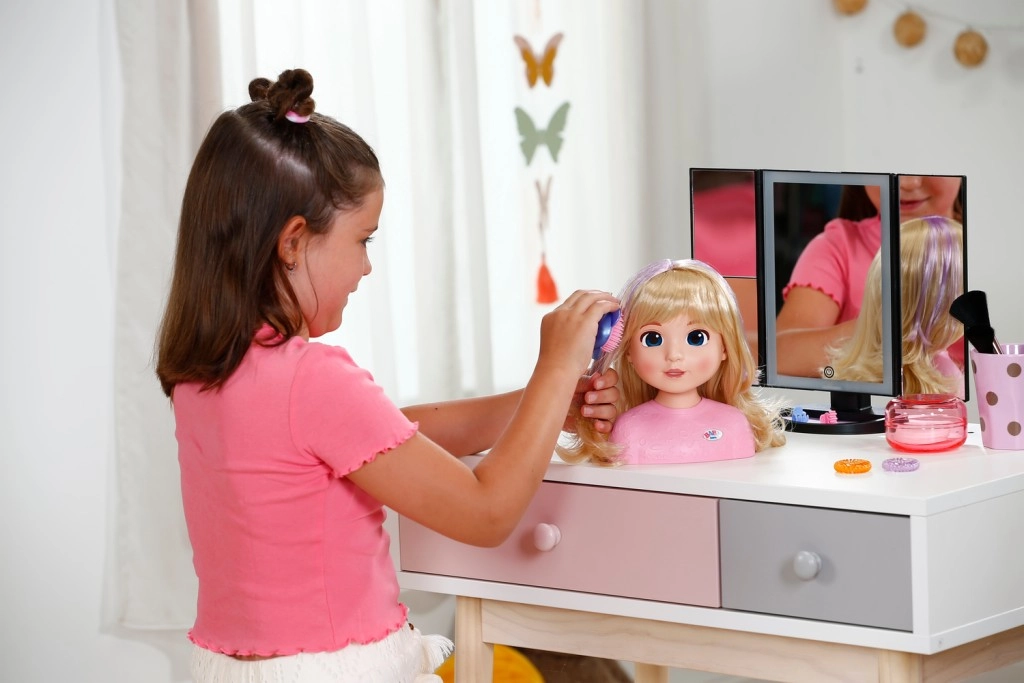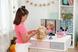 Stabilno postolje osigurava udobno češljanje na stolu ili toaletnom stoliću. Priloženi dodaci – četka, ukosnice i gumice – potiču finu motoriku i uče djecu osnovama njege kose kroz igru. Odlična ideja za poklon malim stilisticama od 3 godine.