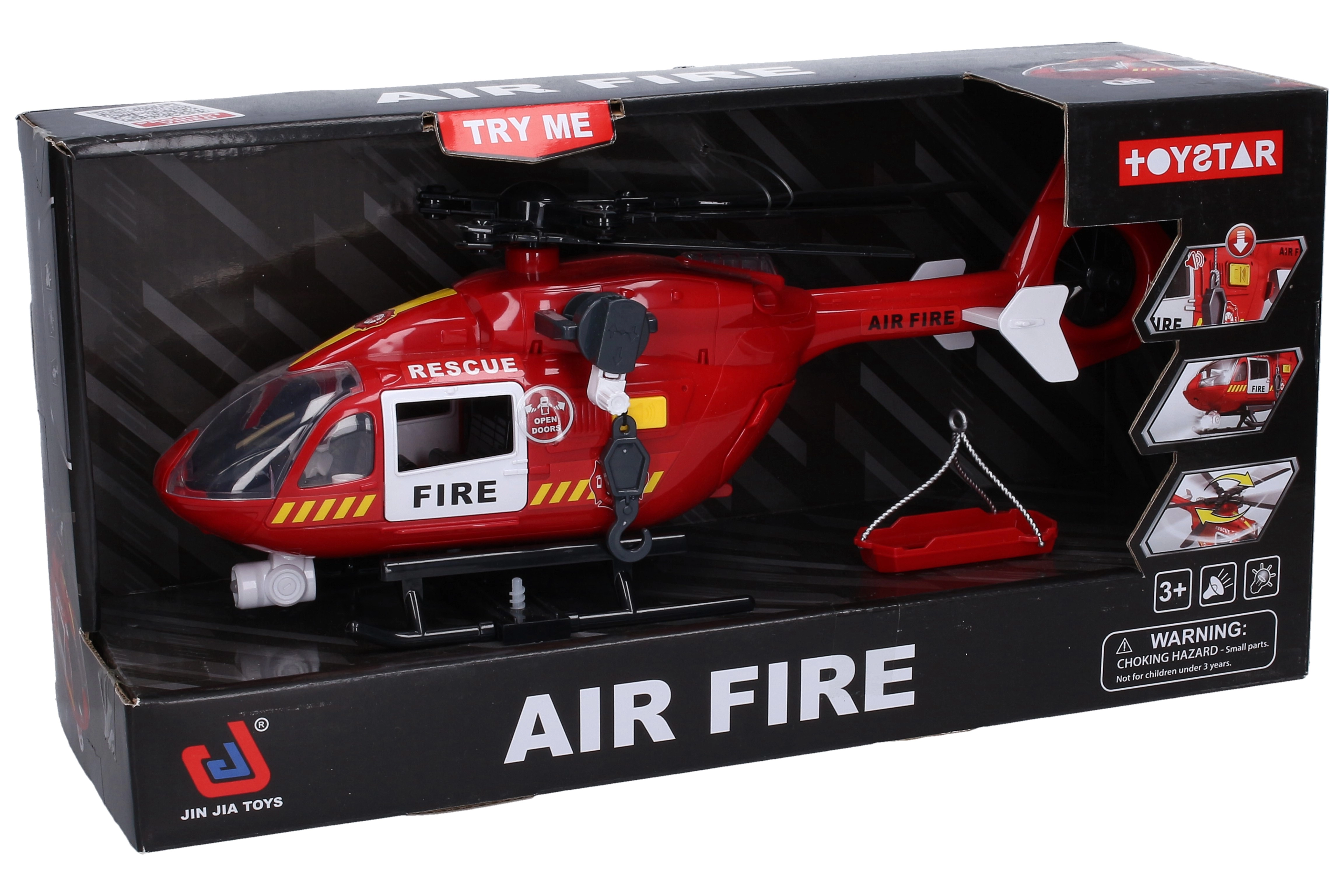 Realističan vatrogasni helikopter duljine 38 cm pobrinut će se za sate akcijske zabave. Nudi svjetlosne i zvučne efekte, otvarajuća prednja i stražnja vrata, izvlačivo uže s kukom i nosila za spašavanje. Baterije 2× AAA su uključene, a sve se lako upravlja gumbom na boku helikoptera.