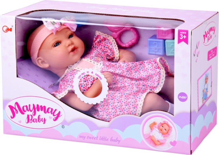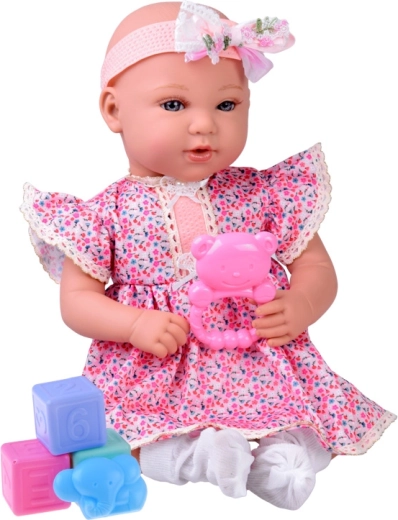 Ugrađeni zvučni modul donosi niz zvukova tipičnih za bebu, pa igra djeluje živahno i zabavno. U setu su i pastelne kockice s brojevima, ružičasta zvečka u obliku medvjedića i mala životinjska igračka koje proširuju mogućnosti igre i učenja.