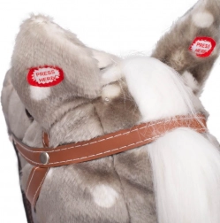 Nakon pritiska na uho, konjić pomiče njuškicu i pušta pjesmicu Prší, prší na češkom ili slovačkom jeziku. Odlično za zabavu i razvoj slušne percepcije.