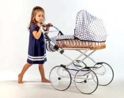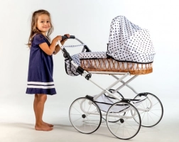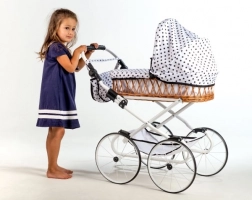 Stilska dječja kolica u retro dizajnu s pletenom košarom od pruća i bijelom konstrukcijom s točkicama razveselit će svaku malu mamu. Sklopiva kapota, podesiva ručka (76 cm), torba preko ručke i donja košara osiguravaju udobnu i zabavnu igru. Prikladno od 3 godine.