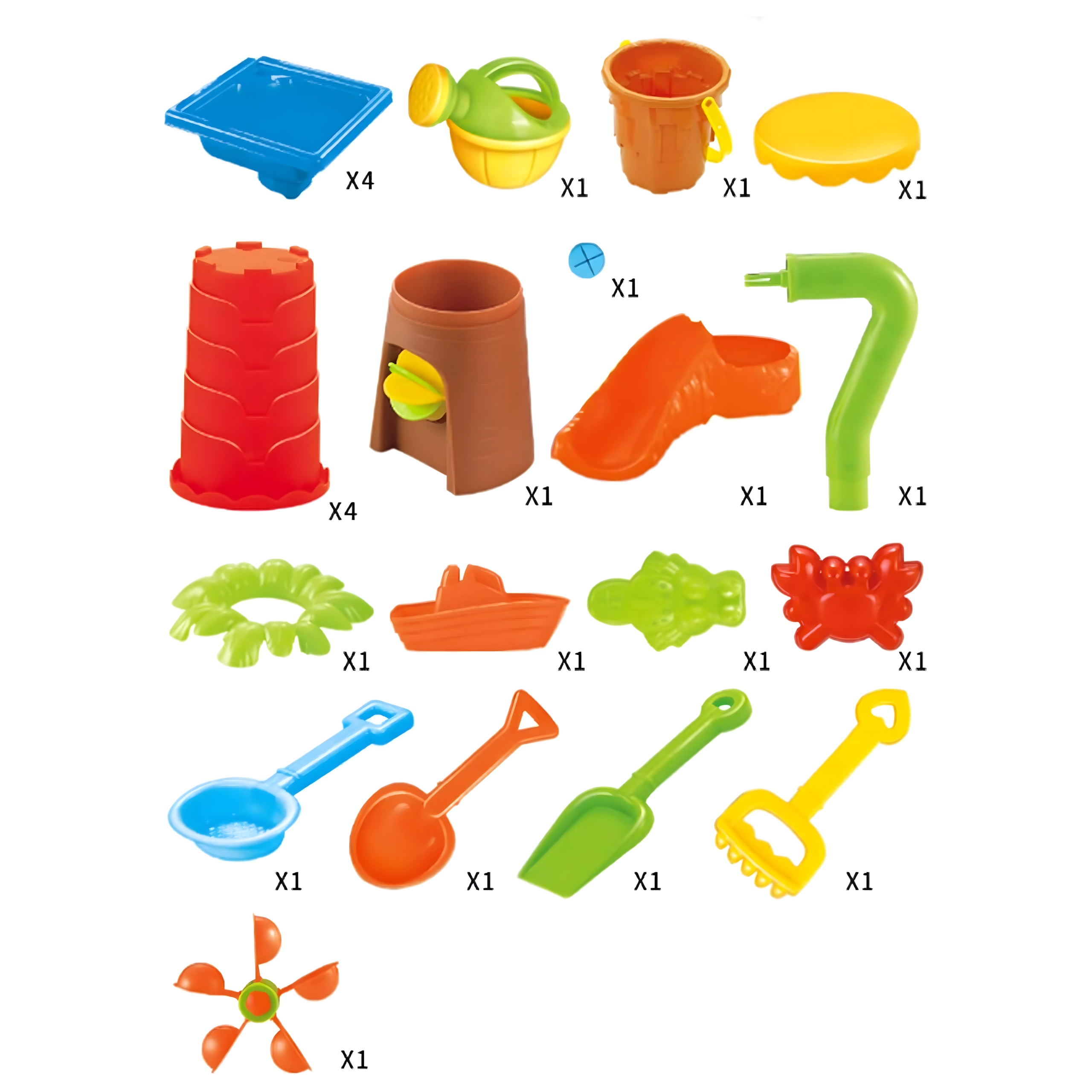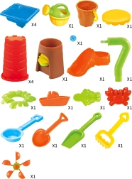 U pakiranju se nalaze kantica za zalijevanje, lopatice, grabljice, sito, kalupi, čašice i mali tobogan – djeca imaju sve pri ruci za beskrajne varijacije igre.