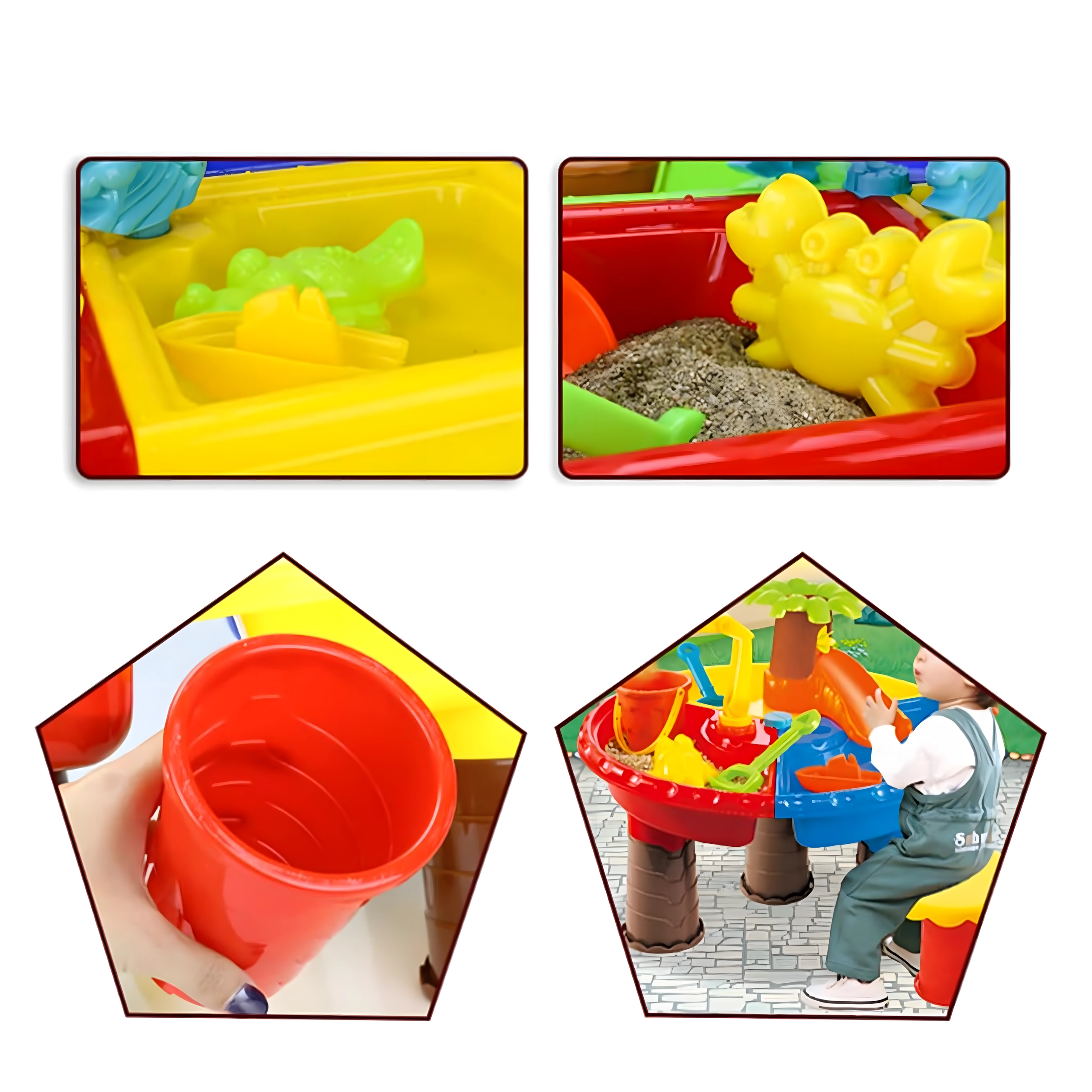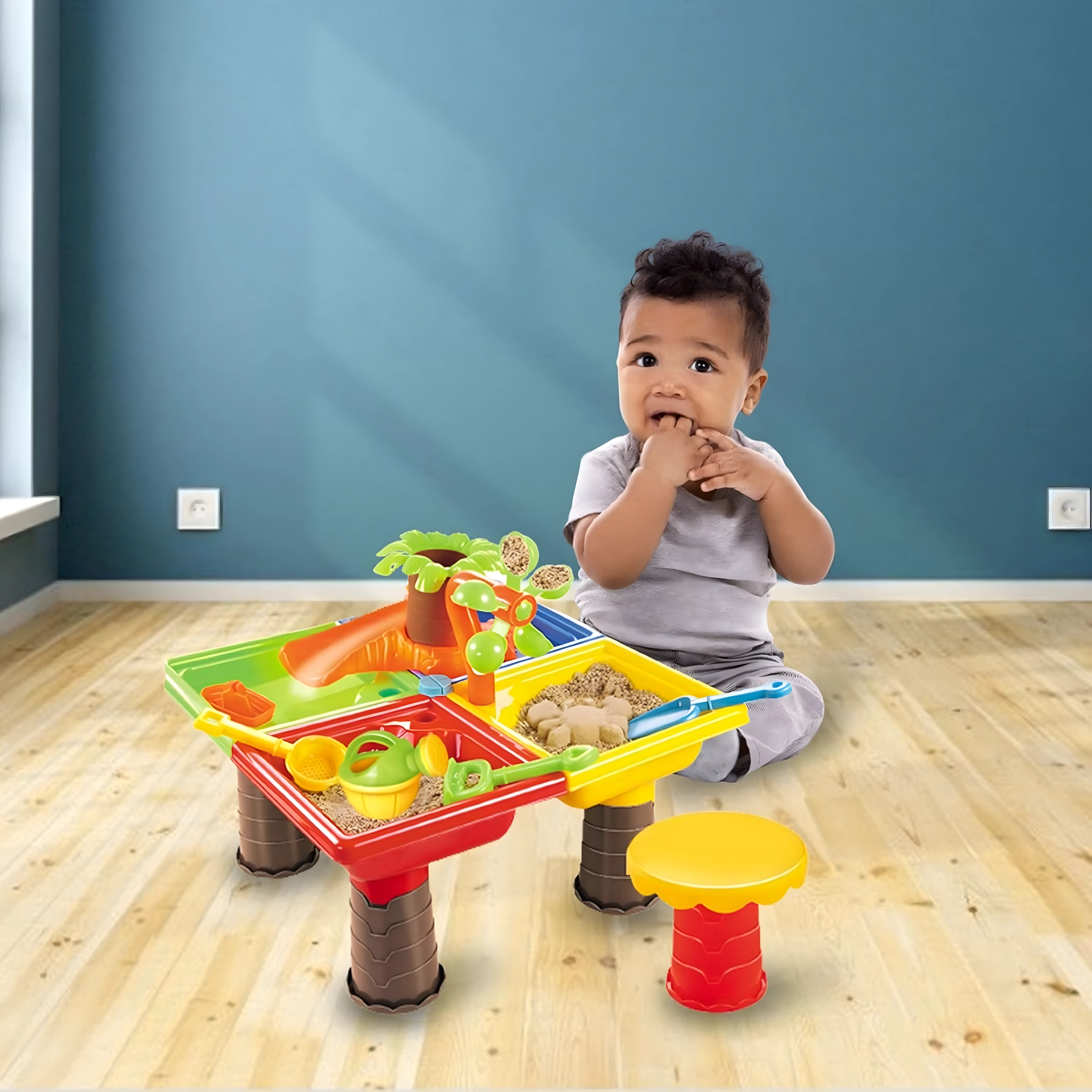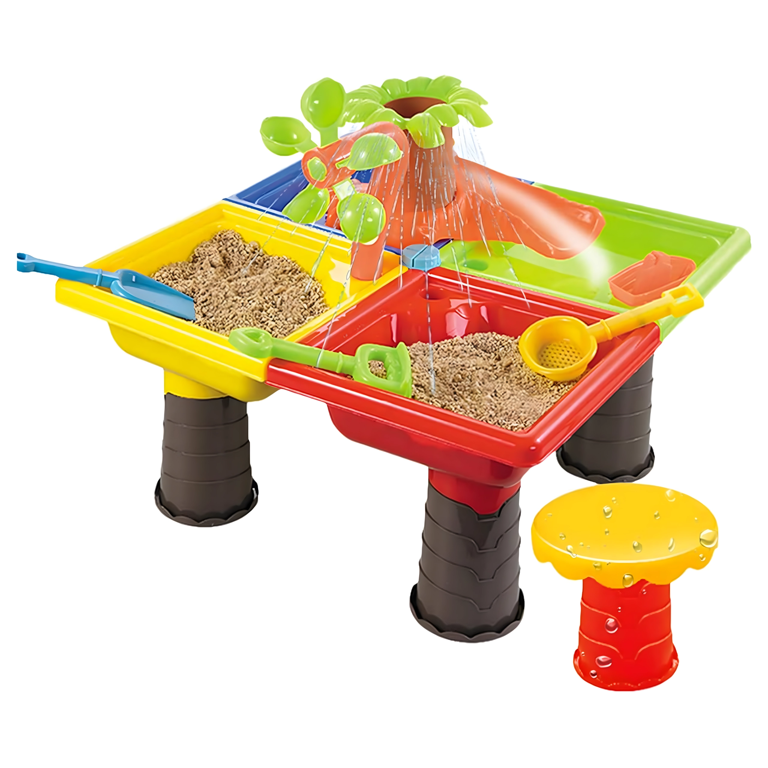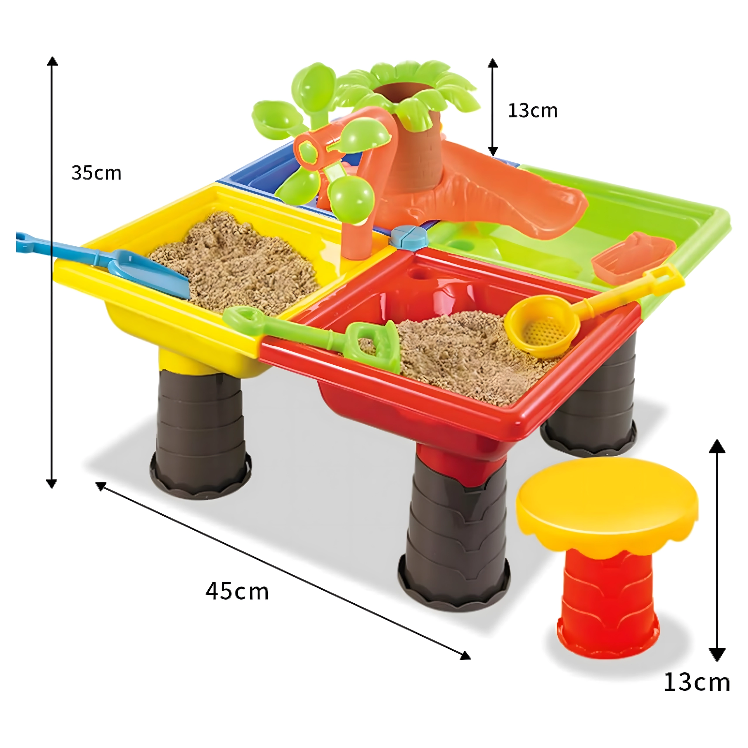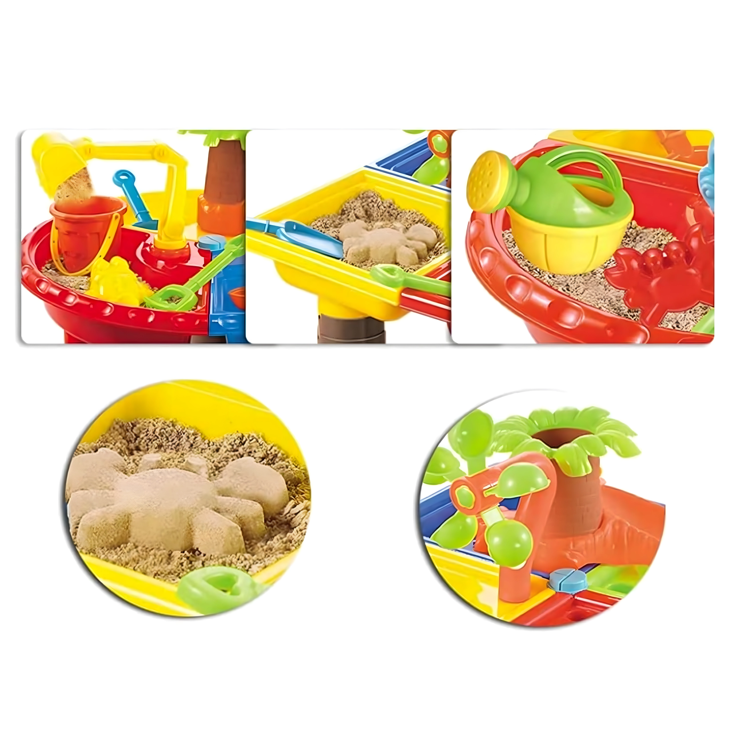 Ovaj multifunkcionalni vodeni i pješčani stolić donosi djeci sate osjetilne zabave. Četiri odjeljka omogućuju kombiniranje vodenih i pješčanih aktivnosti, dok središnji vodeni element s “palmičicom” i okretnim kotačićima pretvara svako nalijevanje u mali spektakl. Laka i izdržljiva konstrukcija jednostavna je za čišćenje, a stabilne noge osiguravaju sigurnu igru na otvorenom i u domu.