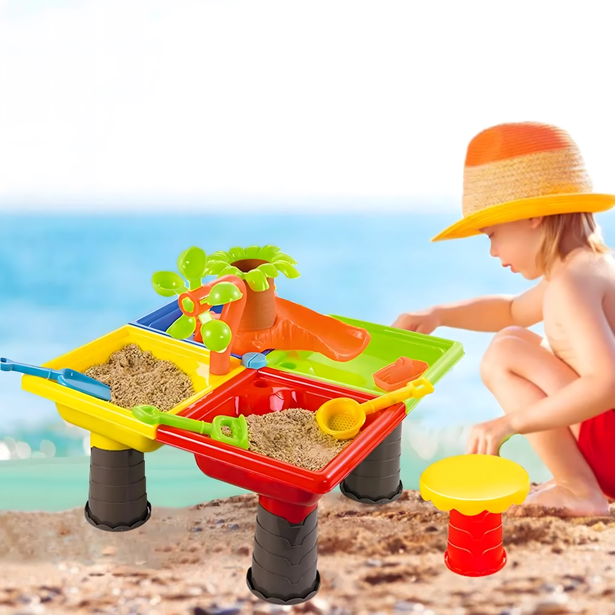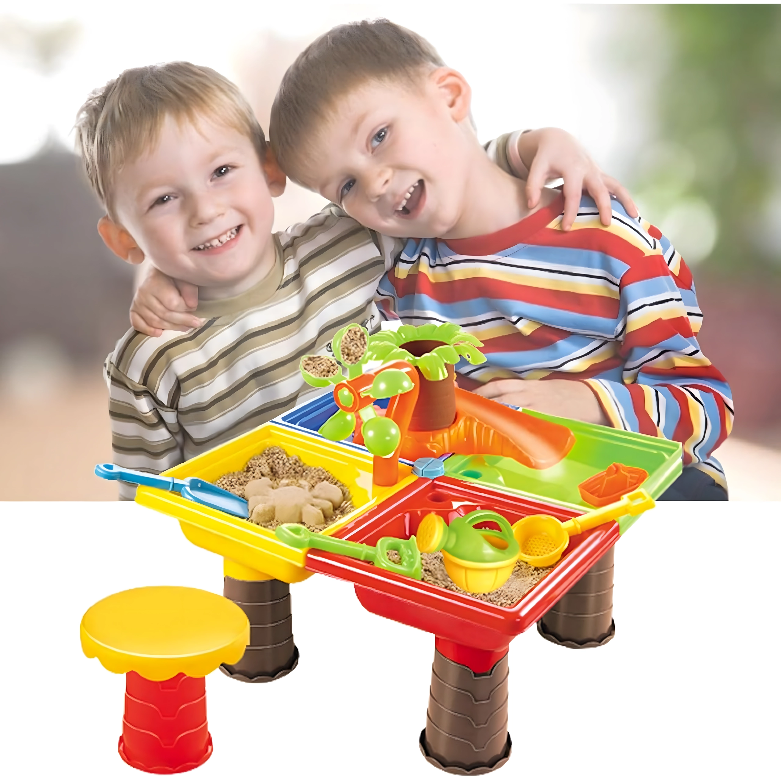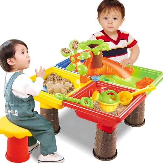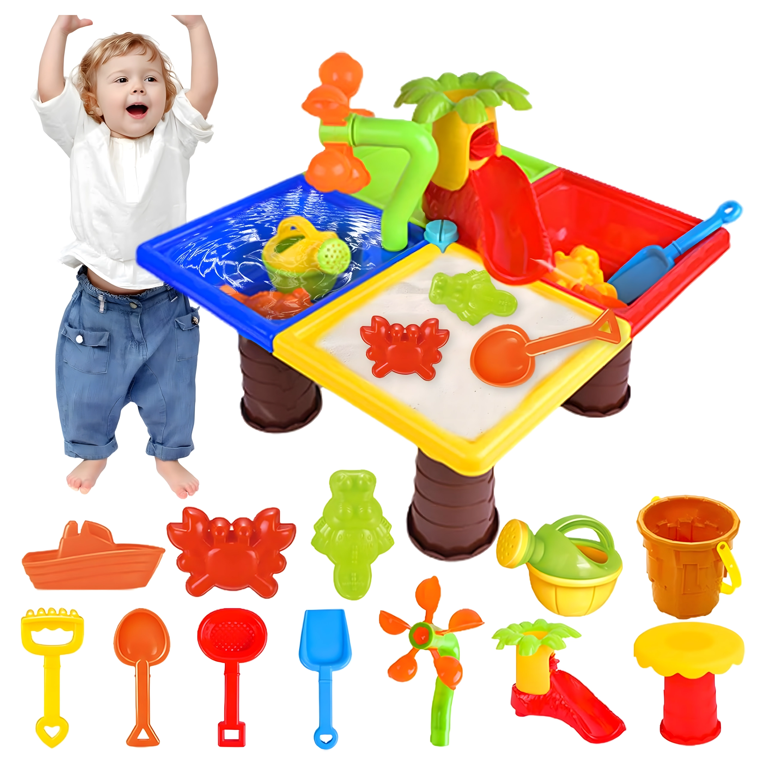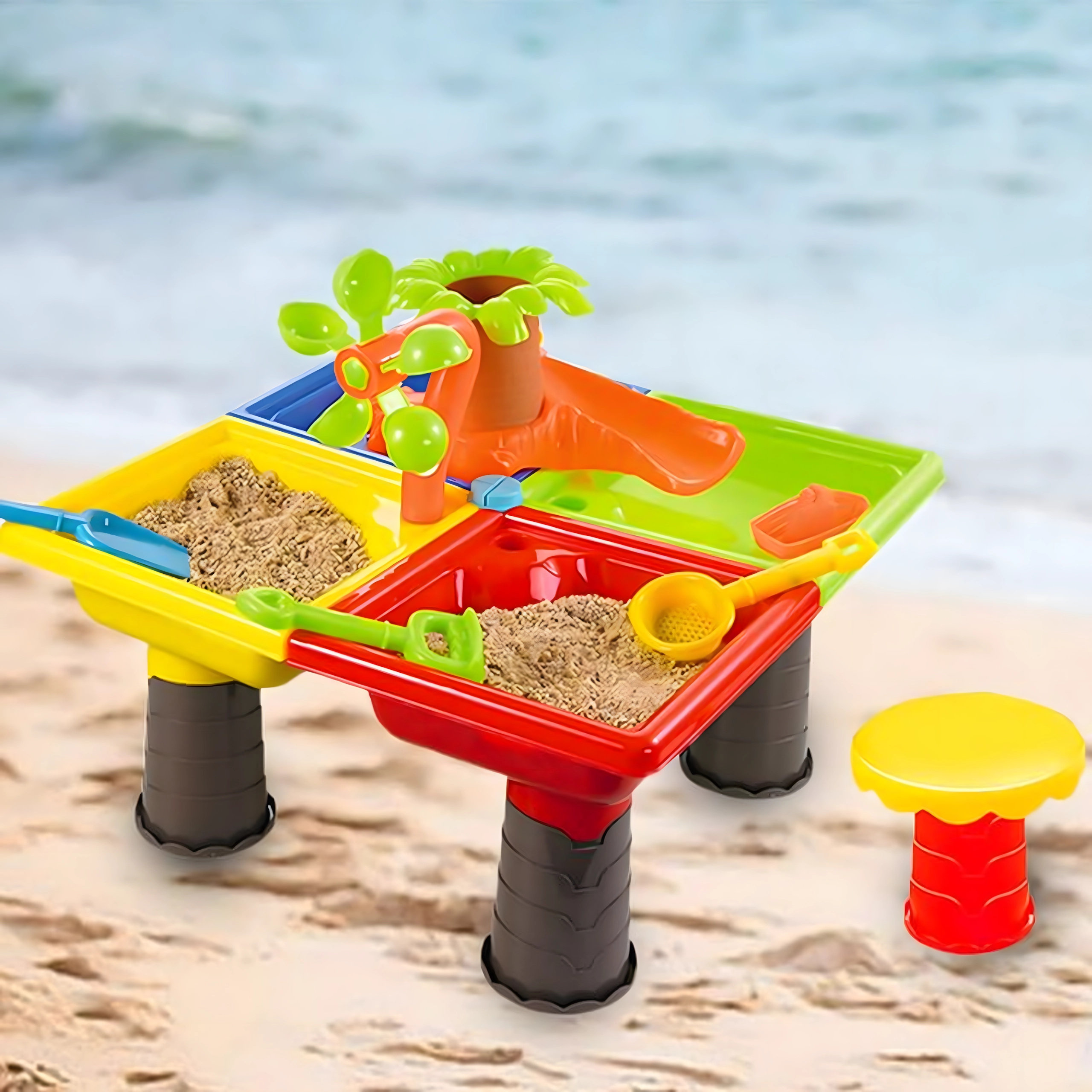 Ovaj multifunkcionalni vodeni i pješčani stolić donosi djeci sate osjetilne zabave. Četiri odjeljka omogućuju kombiniranje vodenih i pješčanih aktivnosti, dok središnji vodeni element s “palmičicom” i okretnim kotačićima pretvara svako nalijevanje u mali spektakl. Laka i izdržljiva konstrukcija jednostavna je za čišćenje, a stabilne noge osiguravaju sigurnu igru na otvorenom i u domu.