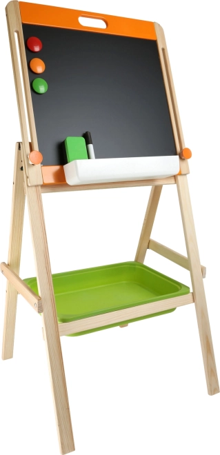 Stabilna drvena konstrukcija s razmaknicama osigurava sigurno pisanje bez klimanja, a praktični zeleni spremnik drži krede, flomaster i magnete uvijek pri ruci. Ploča potiče aktivnu igru, razvoj motorike, mašte i osnova abecede i računanja.