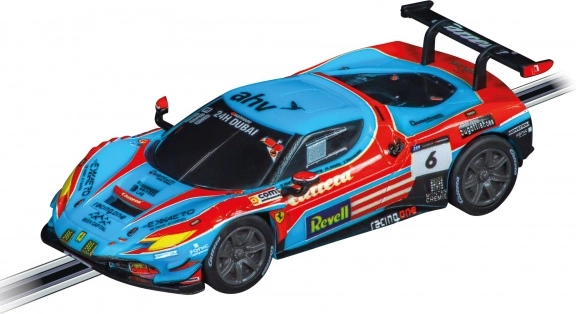 Stilski trkaći automobil Ferrari 296 GT3 za autodrome Carrera GO!! i GO!! Plus u mjerilu 1:43 donosi brzu i stabilnu vožnju zahvaljujući dvojnim kontaktnim četkicama, jakom magnetu i vodilici za sigurno držanje u traci.