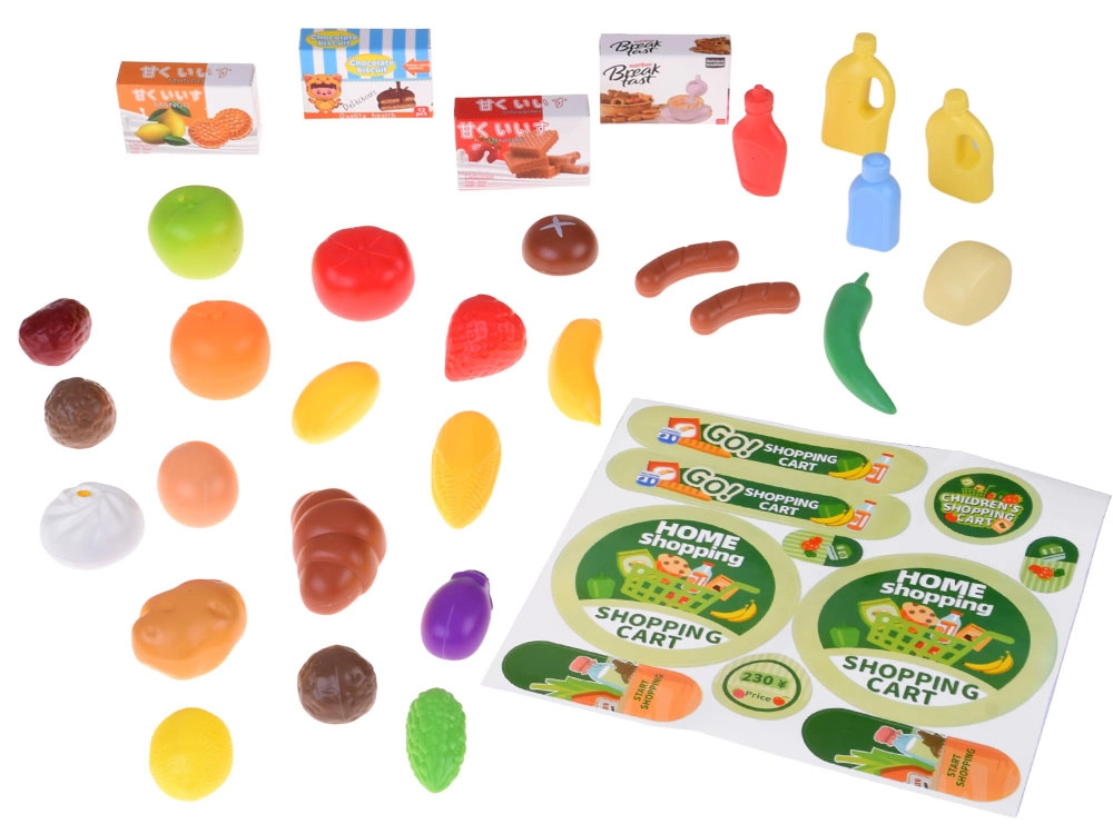 U kompletu su voće, povrće, peciva, napici, kutijice i naljepnice. Djeca će tako uživati u realističnoj kupovini i razvrstavanju namirnica.