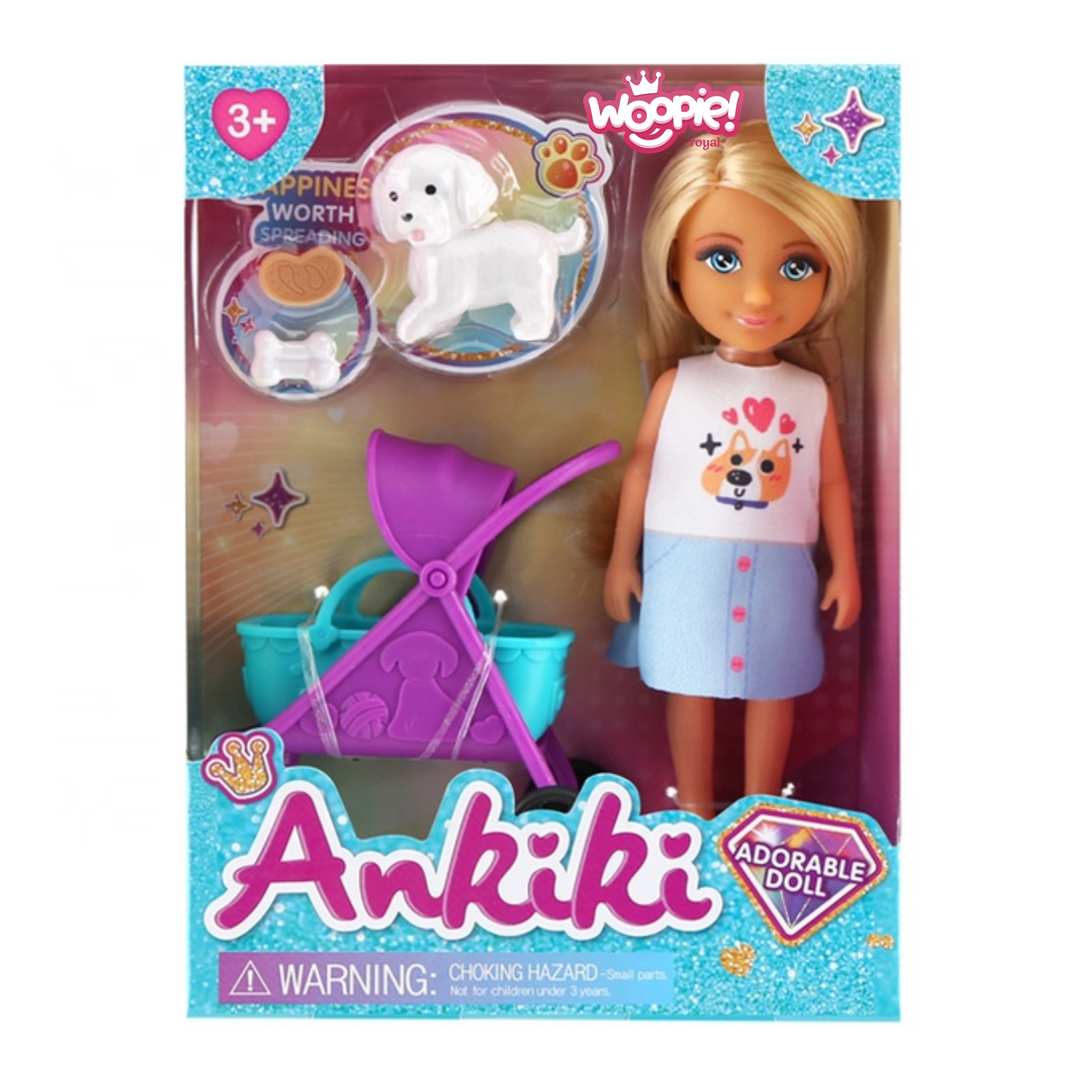 • Stilizirana lutka: plava kosa, plave oči, bijela bluza s otiskom psića, svijetloplava suknjica.