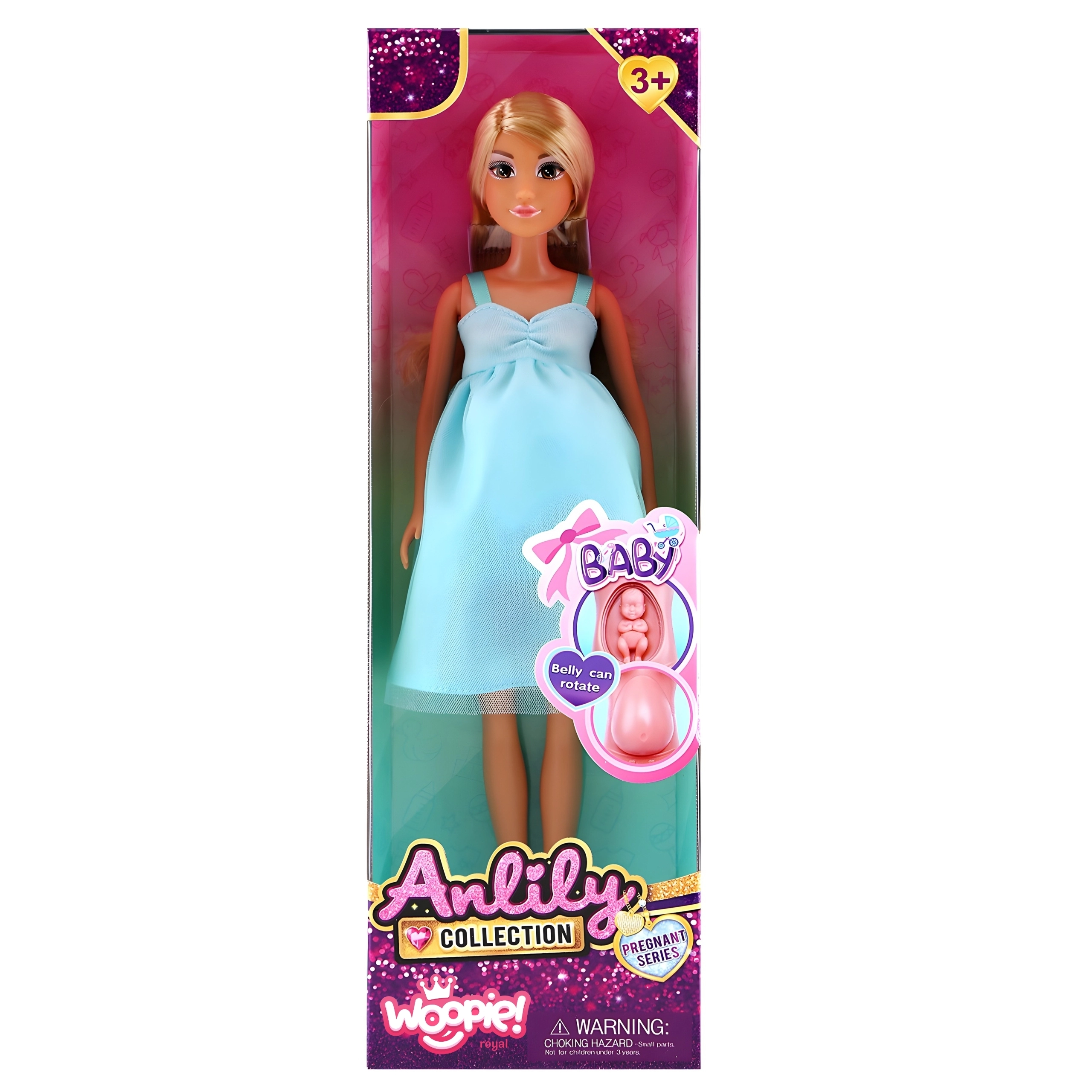 Otkrijte čaroliju obiteljskih igara s lutkom Lily brenda WOOPIE – realističnom trudnom lutkom s rotirajućim trbuščićem iz kojeg se može izvaditi beba. Ima nježne crte lica, plavu kosu i nosi elegantnu plavu haljinu. Odličan izbor za djecu od 3 godine naviše, koji poticanja empatiju, brigu i društvene vještine.