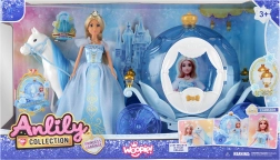 Očaravajući set za male ljubiteljice bajki donosi sve za kraljevsku zabavu: princezu u svjetlucavoj plavoj haljini s krunom, veličanstvenog bijelog konja i veliku kočiju s prozirnim elementima koja tijekom igre svijetli. Duge plave (blond) vlasi lutke i detaljni dodaci potiču maštu i pripovijedanje priča.