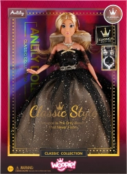 Otkrijte svijet mode i profinjenosti s lutkom Lily od Woopie. Njezina očaravajuća crno‑zlatna haljina ukrašena je bezbrojnim flitrama koji se prekrasno presijavaju. Duga zlatno plava kosa jednostavno poziva na češljanje, pletenje i stvaranje originalnih frizura.