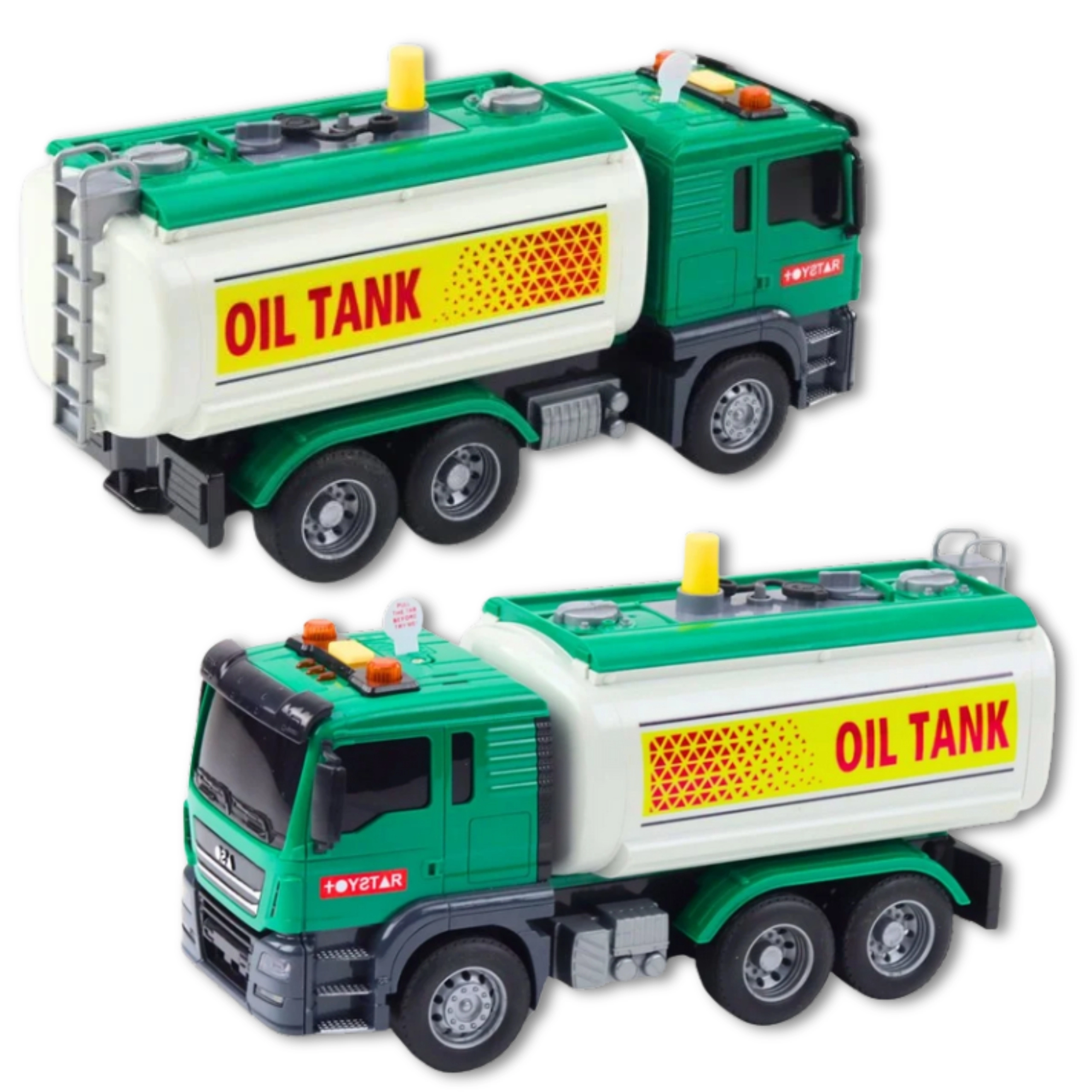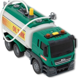 Ova zelena tehnička cisterna za vodu u mjerilu 1:14 donosi djeci realistčnu zabavu. Dovoljno je napuniti spremnik, pritisnuti žuti gumb pumpe i voda će poteći iz crijeva – idealno za simulaciju točenja i akcijskih scenarija igre. Na krovu kabine nalaze se tipke s efektima – truba, vožnja unatrag i zvukovi motora uz bljeskajuća svjetla.