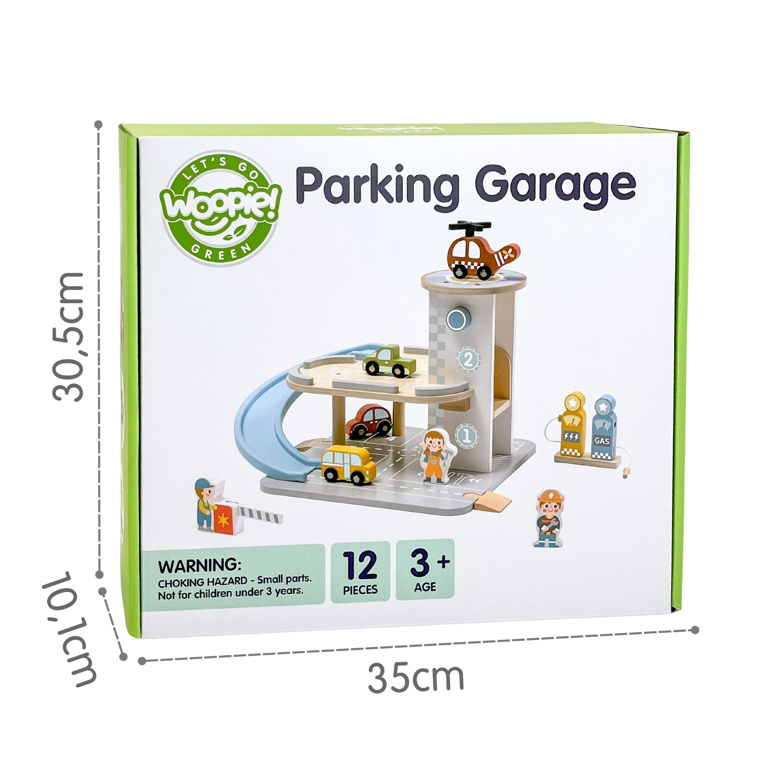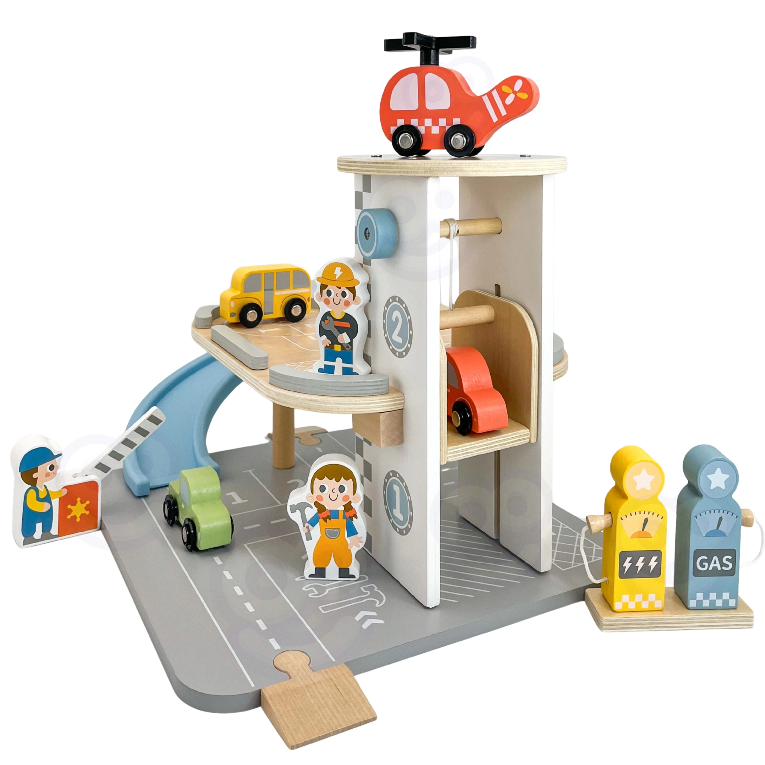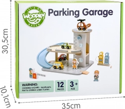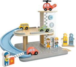 Drveno parkiralište 2-u-1 kombinira garažu na dva kata i benzinsku stanicu, kako bi se djeca mogla igrati vožnje, parkiranja i točenja goriva. Autići jure niz plavu spiralnu rampu, helikopter s rotirajućim propelerom slijeće na krovni heliodrom, a figurice posade brinu se o prometu. Kvalitetna drvena izrada i stabilna baza osiguravaju sigurnu igru od 3 godine naviše.
