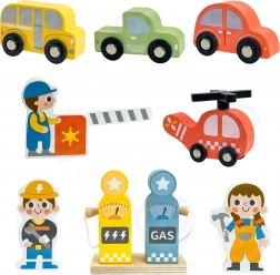 Sadrži šarene drvene autiće, helikopter s rotirajućim propelerom, figurice radnika i pribor za realističnu igru.