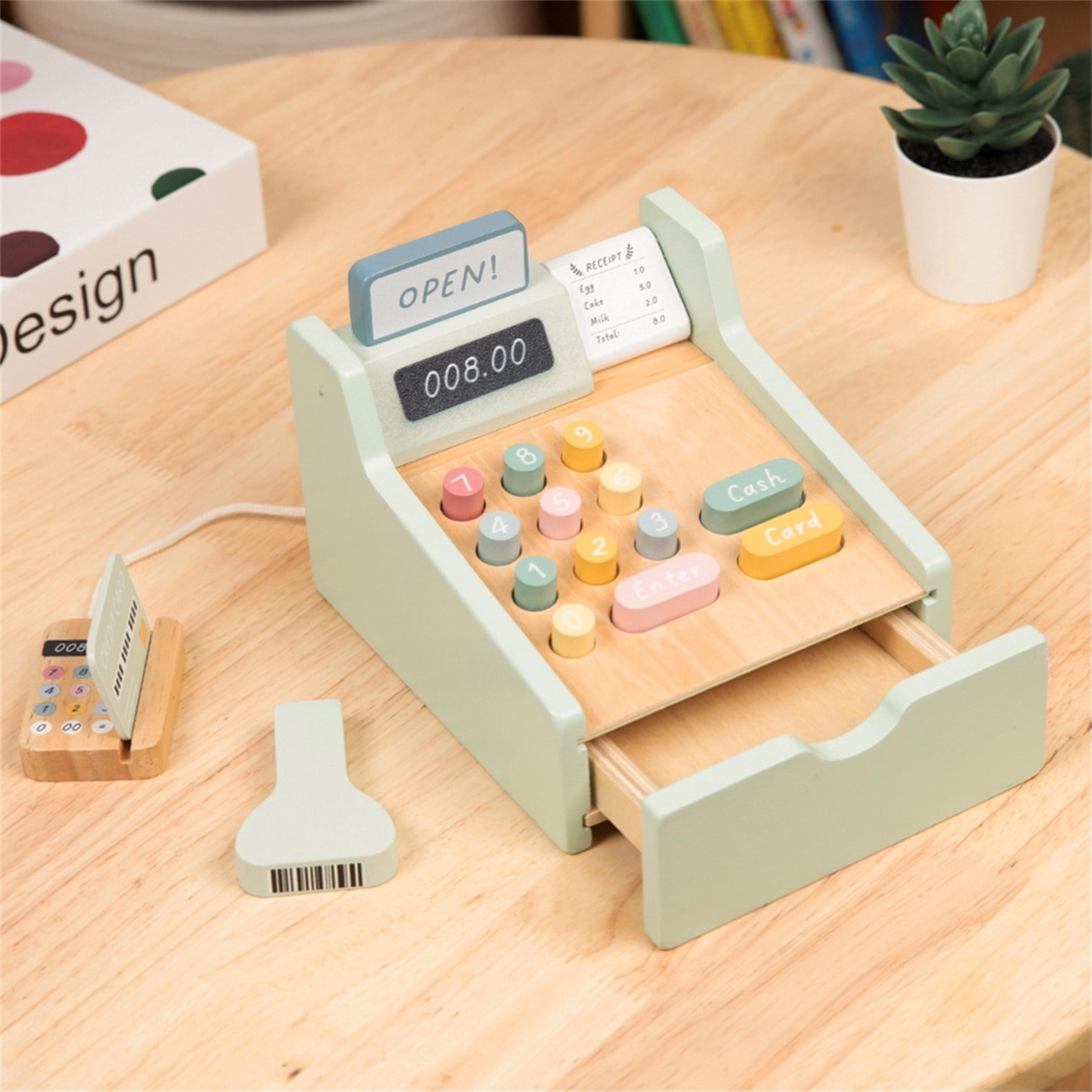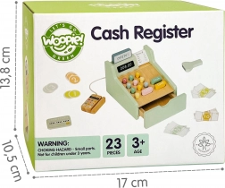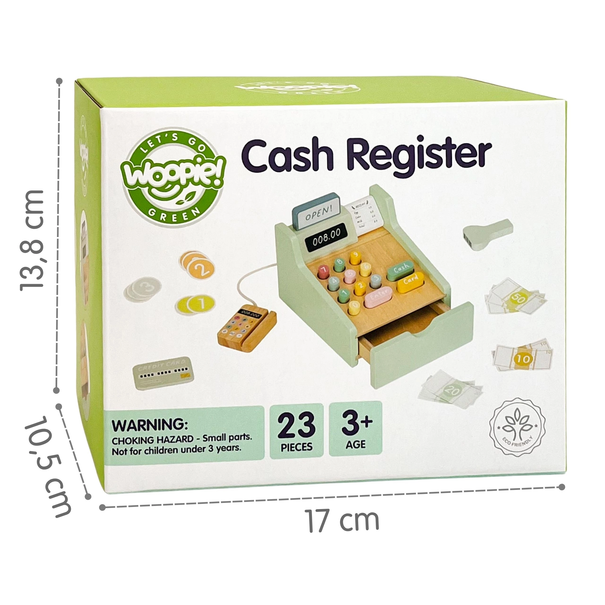 Drvena blagajna WOOPIE GREEN idealna je igračka za djecu od 3 godine koja vole igru trgovine, kafića ili restorana. Zahvaljujući funkcionalnim elementima poput izvlačne ladice za novac, skenera barkodova i čitača platnih kartica, djeca se uče osnovama plaćanja i rukovanja novcem na prirodan i zabavan način.
