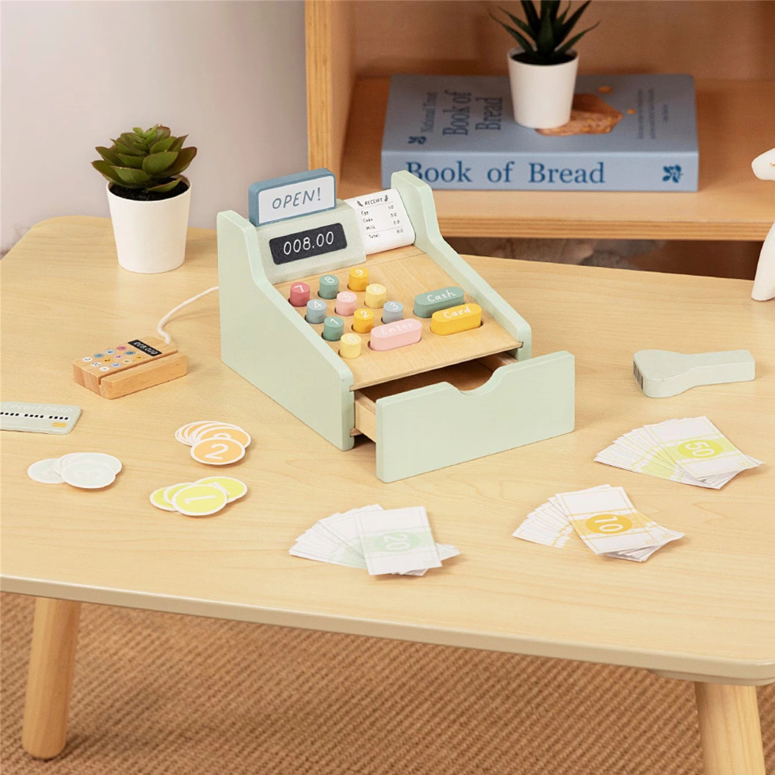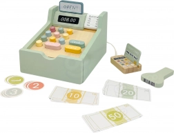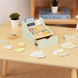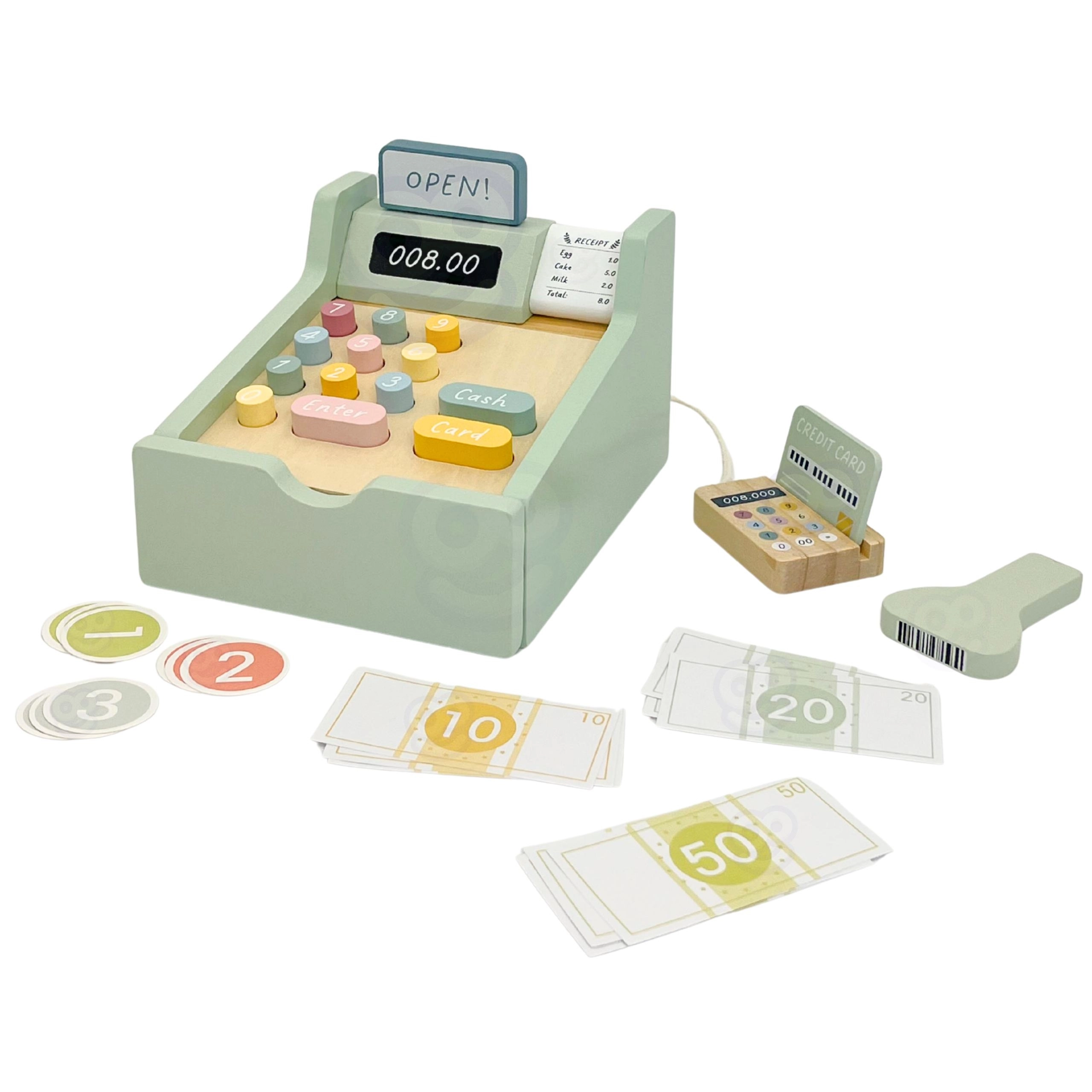 Pretvorite dječji kutak u vlastitu trgovinicu s ovom prekrasnom drvenom blagajnom WOOPIE GREEN. Pastelne boje, kvalitetno drvo i bogat pribor potiču kreativnu igru, računanje i razvoj fine motorike. U kompletu su skener, čitač kartica, platna kartica, novčanice i kovanice za realističnu igru trgovine.