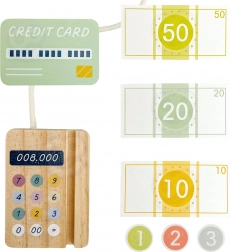Set sadrži sve što malom trgovcu treba: drvenu blagajnu s obojenim tipkama, skener, čitač kartica, platnu karticu, kovanice i novčanice. Igra razvija logičko razmišljanje, matematičke vještine, koordinaciju i komunikaciju u ulozi prodavača i kupca.