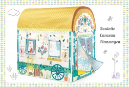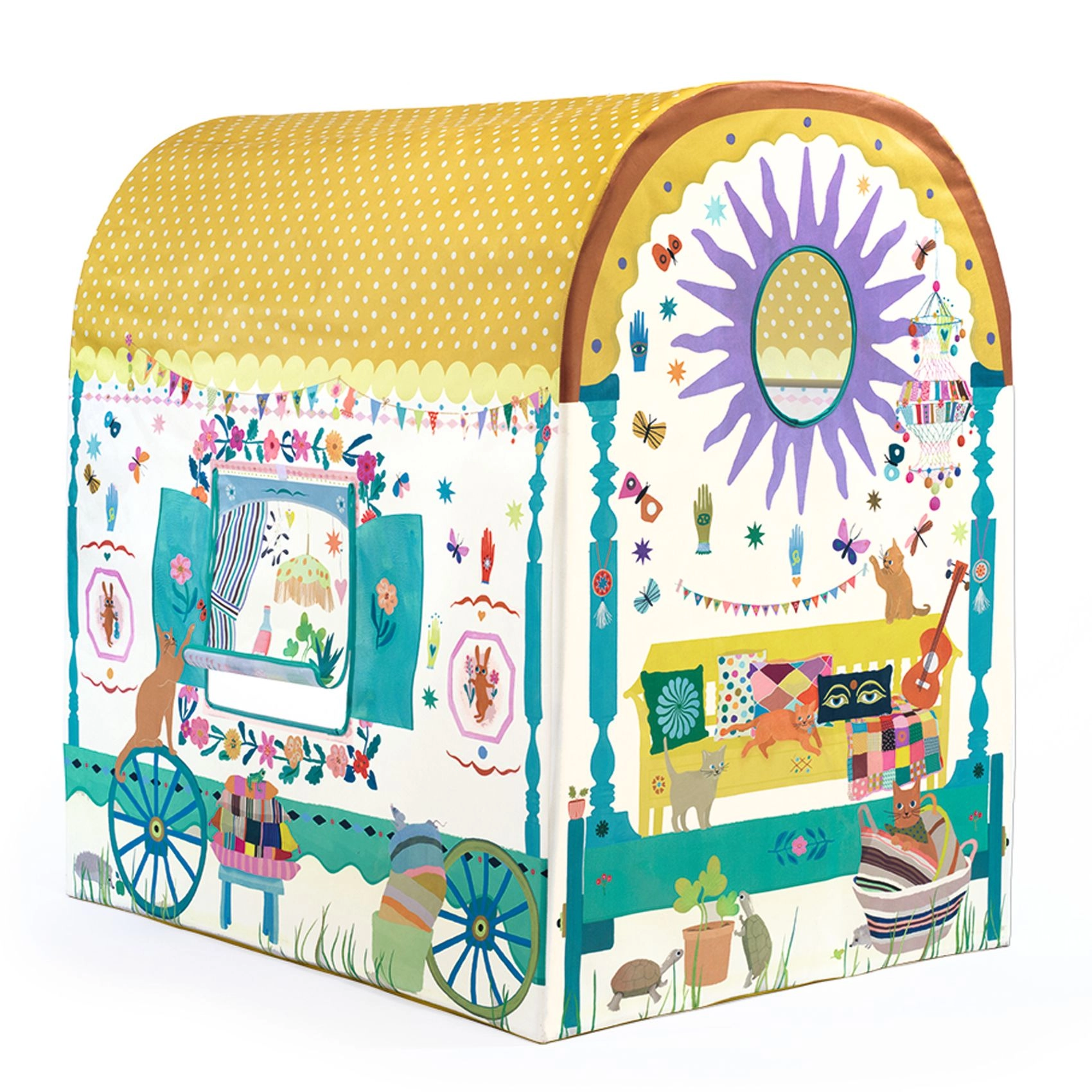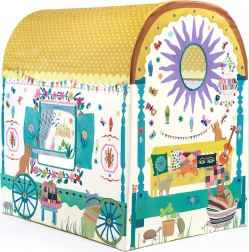 Ovaj prostrani DJECO igraći šator u stilu karavana djeci nudi njihov vlastiti tajni kutak za čitanje, odmor i maštovite igre. Zahvaljujući zaobljenom krovu s točkicama, tiskanim prozorima i veselim dekoracijama djeluje kao mala kućica koja lijepo upotpunjuje svaku dječju sobu.