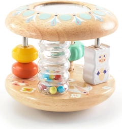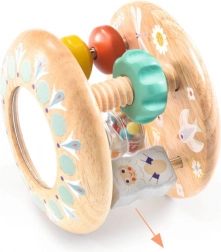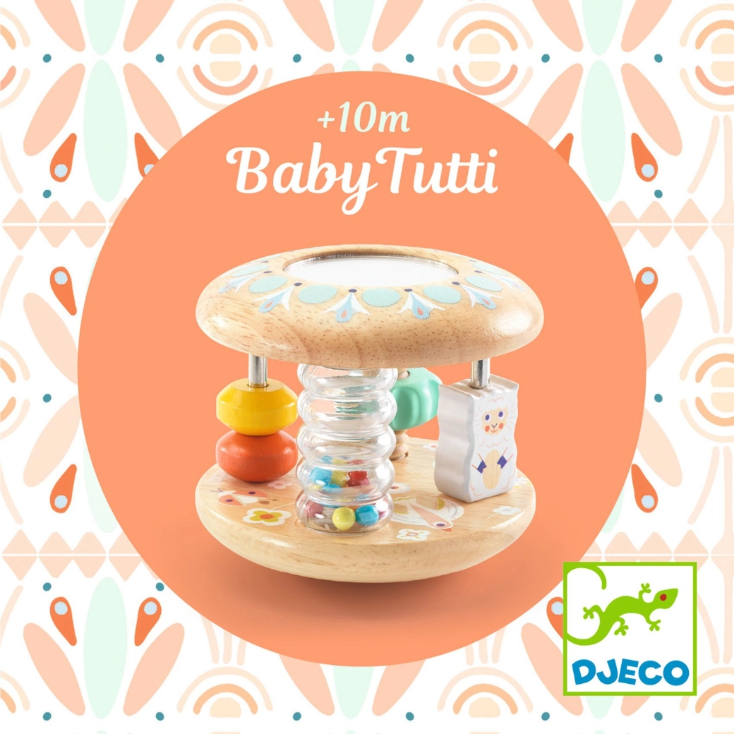 Baby Tutti je promišljena drvena igračka koja se lako preuzima, ugodno zvecká i nakon odlaganja se kotrlja. Djecu će privući šareni presip perlica u prozirnoj cijevi, malo ogledalce za prva otkrivanja i klizni prsteni na štapićima. Igračka podržava koordinaciju ruka–oko te motivira na puzanje i okretanje.