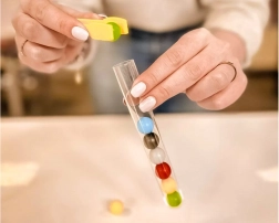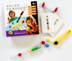 Ova originalna edukativna igra inspirirana metodom MONTESSORI potiče učenje kroz aktivnost. Djeca hvataju obojene kuglice pincetom i umeću ih u epruvetu, bilo slobodno, bilo prema kartama s uzorcima. Tako uvježbavaju preciznost pokreta, strpljenje i vidno-motoričku koordinaciju.