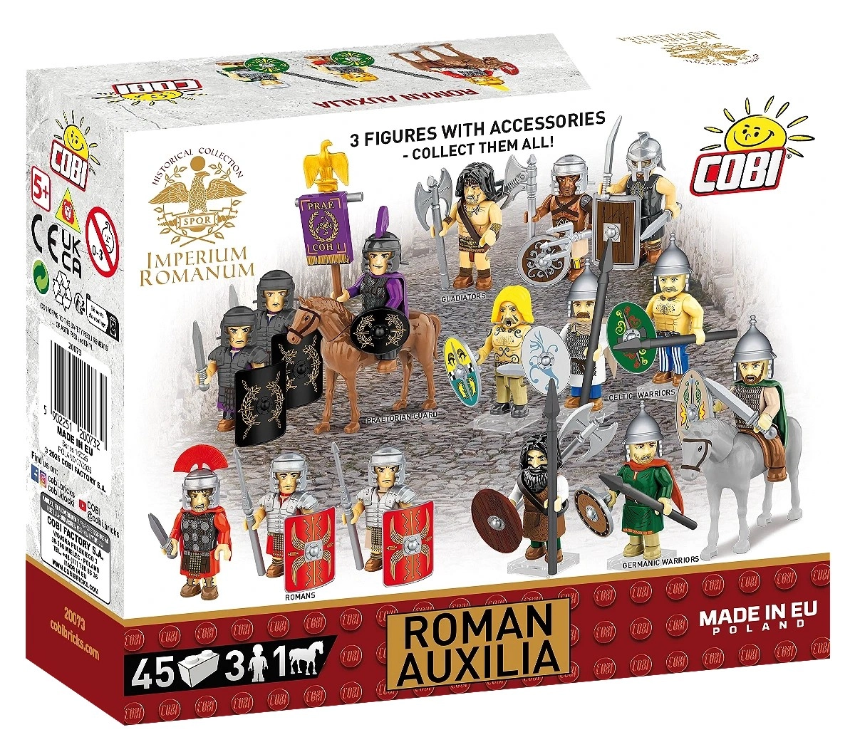 Otkrijte svijet IMPERIUM ROMANUM s kompletom ROMAN AUXILIA od 45 dijelova. Dobivate 3 detaljne minifigurice (2 pješaka i 1 konjanika), konja sa sedlom i bogatu opremu uključujući nove ovalne štitove, tisak lorica hamata i plašteve. Kvalitetni trajni otisci bez naljepnica, jednostavne intuitivne upute i kompatibilnost s drugim markama čine ovaj set izvrsnim izborom za djecu od 8 godina naviše i odrasle kolekcionare.