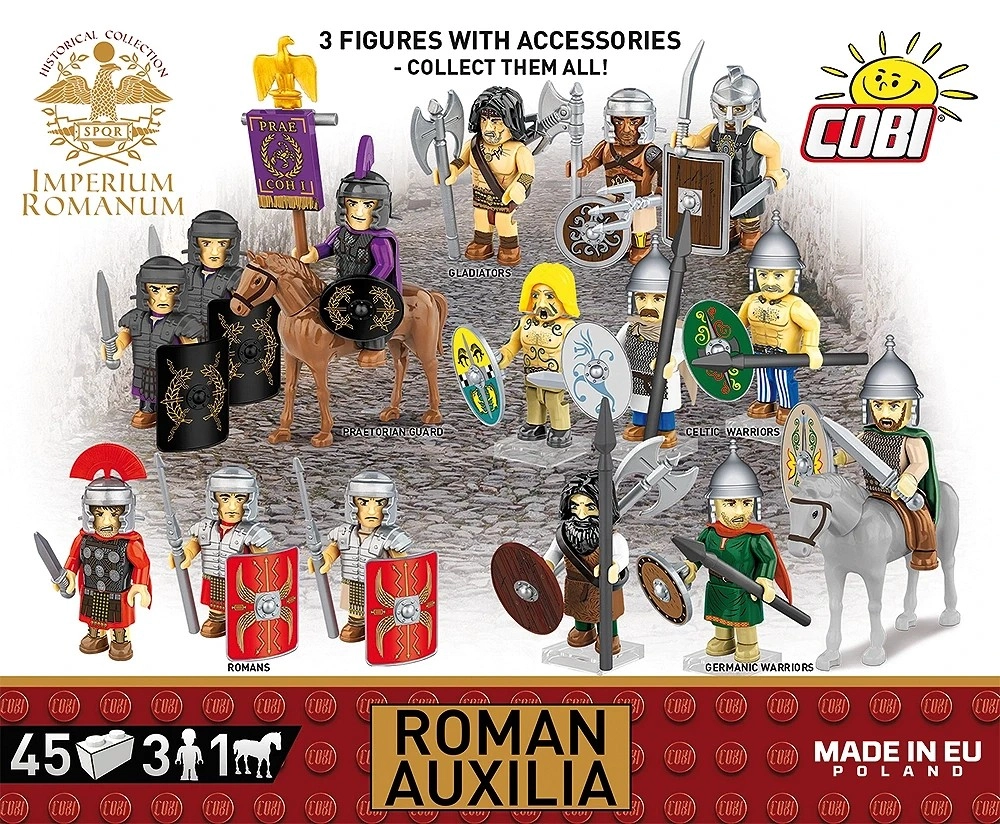 Proširite svoje carstvo elitnim pomoćnim jedinicama ROMAN AUXILIA. Set nudi tri potpuno pokretne figurice s povijesno usklađenim detaljima, novim ovalnim štitovima s otiscima, realističnim kacigama, kopljima i mačem gladius. Ne nedostaje ni konj sa sedlom za konjičke manevre i dojmljive diorame.