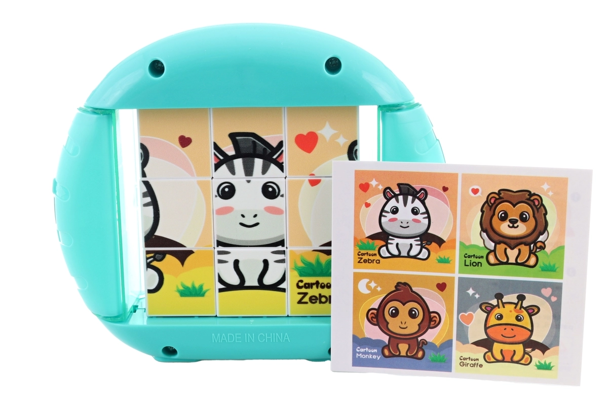 Zabavna i edukativna slagalica za djecu od 3 godine koja razvija logičko razmišljanje, finu motoriku i strpljenje. Okretanjem i pomicanjem kockica djeca slažu slike četiri omiljene životinje. Kompaktna plastična izrada i pakiranje u prozirnoj kutijici čine je idealnom igračkom za putovanja.