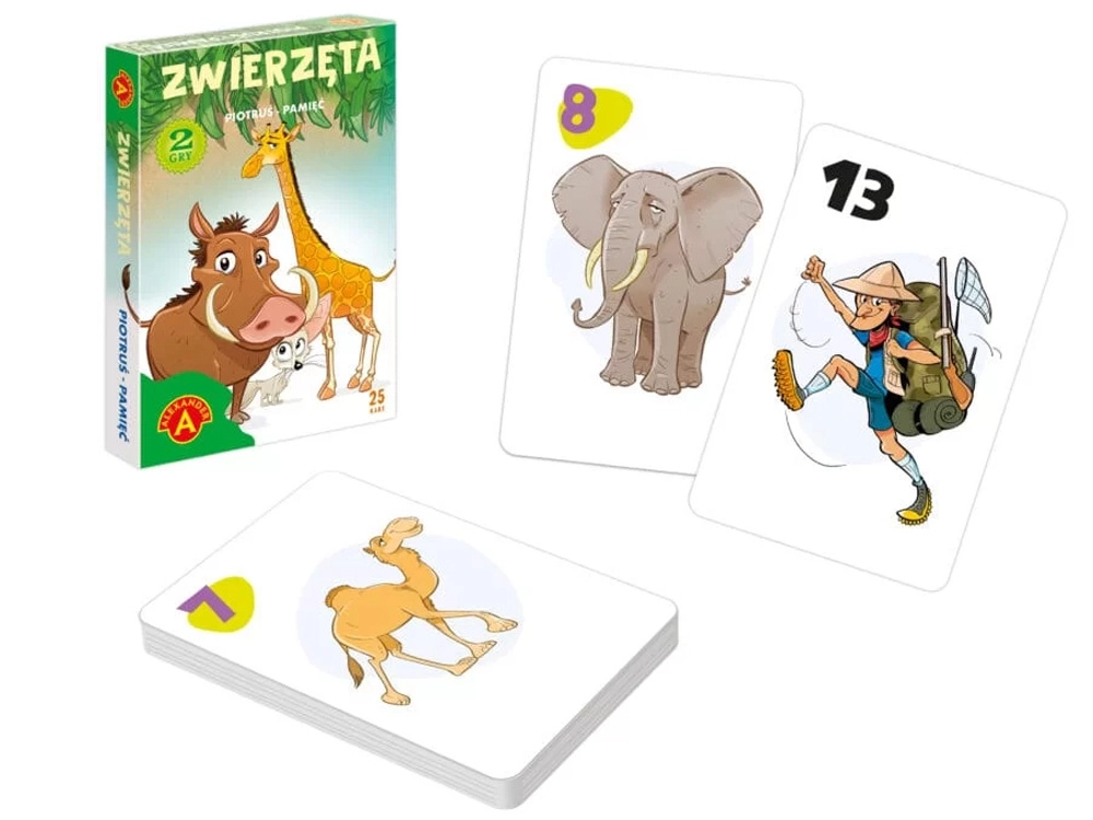 U varijanti Piotruś cilj je skupljati parove istih životinja i izbjeći kartu “Piotruś”. Igra Pamćenje trenira koncentraciju i vizualno pamćenje – igrači okreću karte i nastoje pronaći podudarne parove. Kompaktno pakiranje stane u ruksak, pa je idealno za vrtiće, izlete i godišnje odmore.