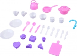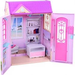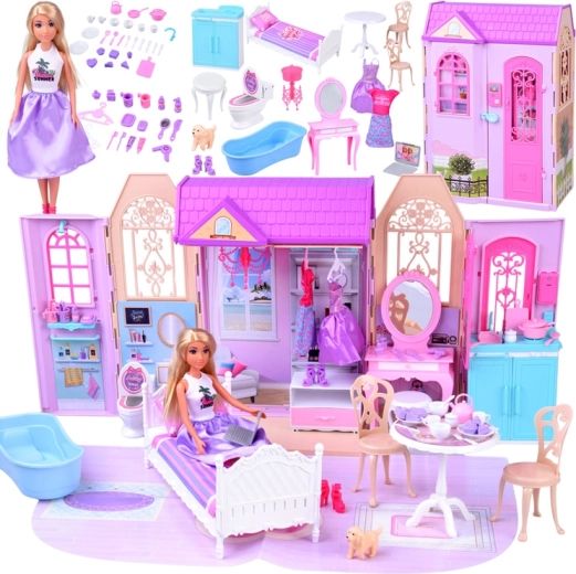 Sklopiva ružičasto‑ljubičasta kućica osmišljena je kao praktičan kovčeg koji djeca lako ponesu u vrtić, na praznike ili prijateljima. Nakon rasklapanja stvara ugodan mini dom s tri potpuno opremljene zone: kupaonicom za duge kupke, spavaćom sobom s toaletnim stolićem za stiliziranje i odmor te kuhinjom – srcem svake kućice.